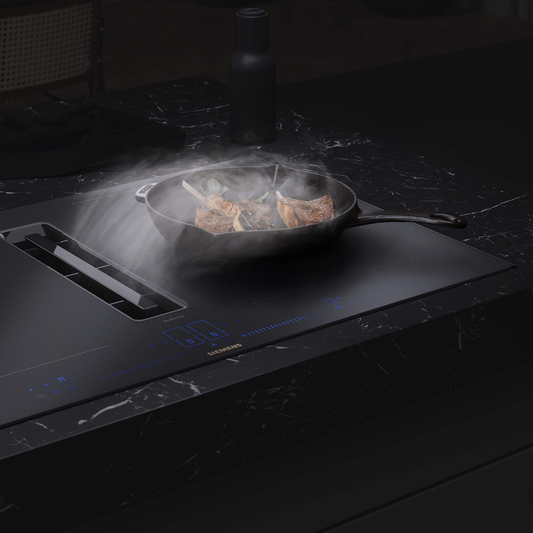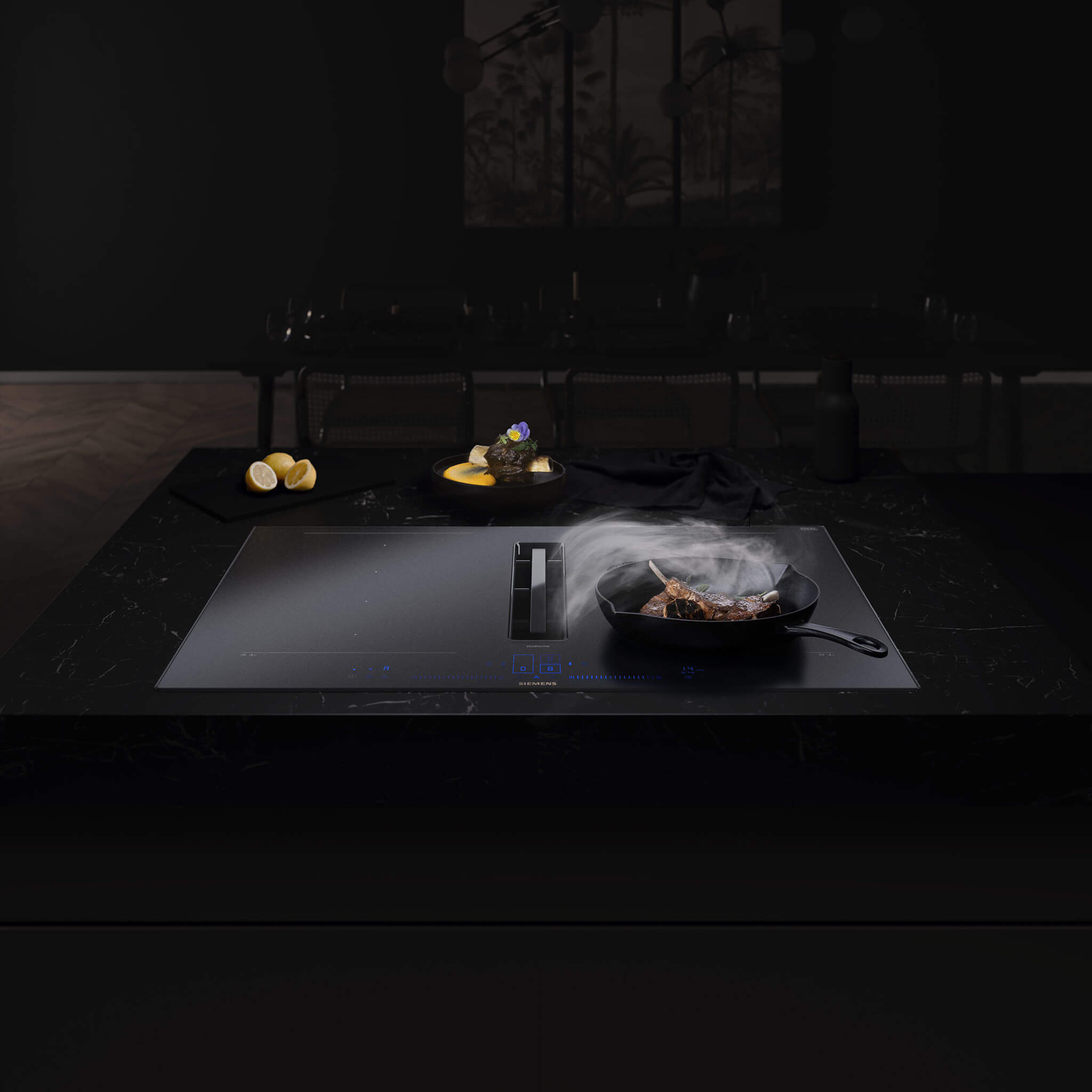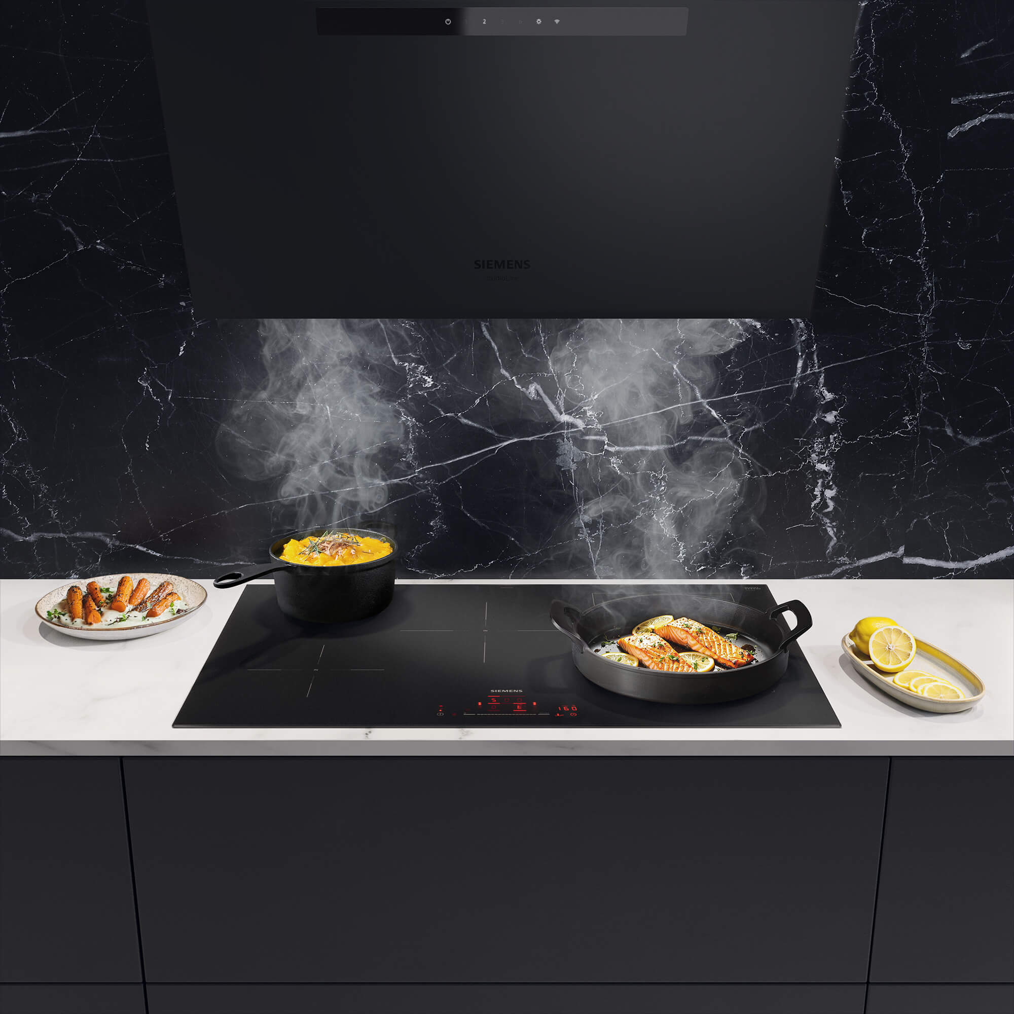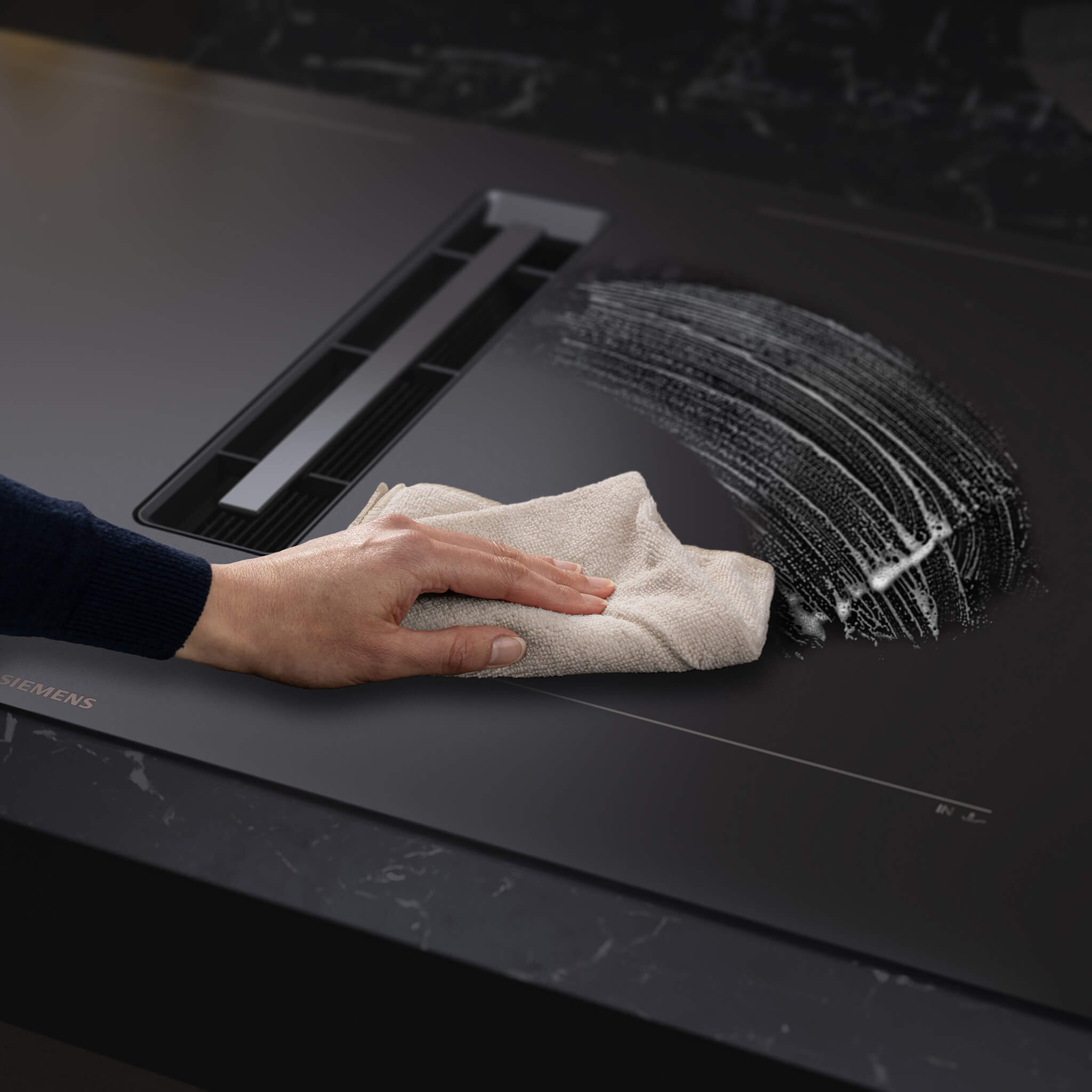 De matte glasafwerking vermindert reflectie en verbergt vlekken, terwijl u geniet van krachtige prestaties en een intuïtieve bediening. Liever een kookplaat zonder geïntegreerde afzuiging? Ook dat kan, en deze is perfect te combineren met de matzwarte Siemens afzuigkappen.