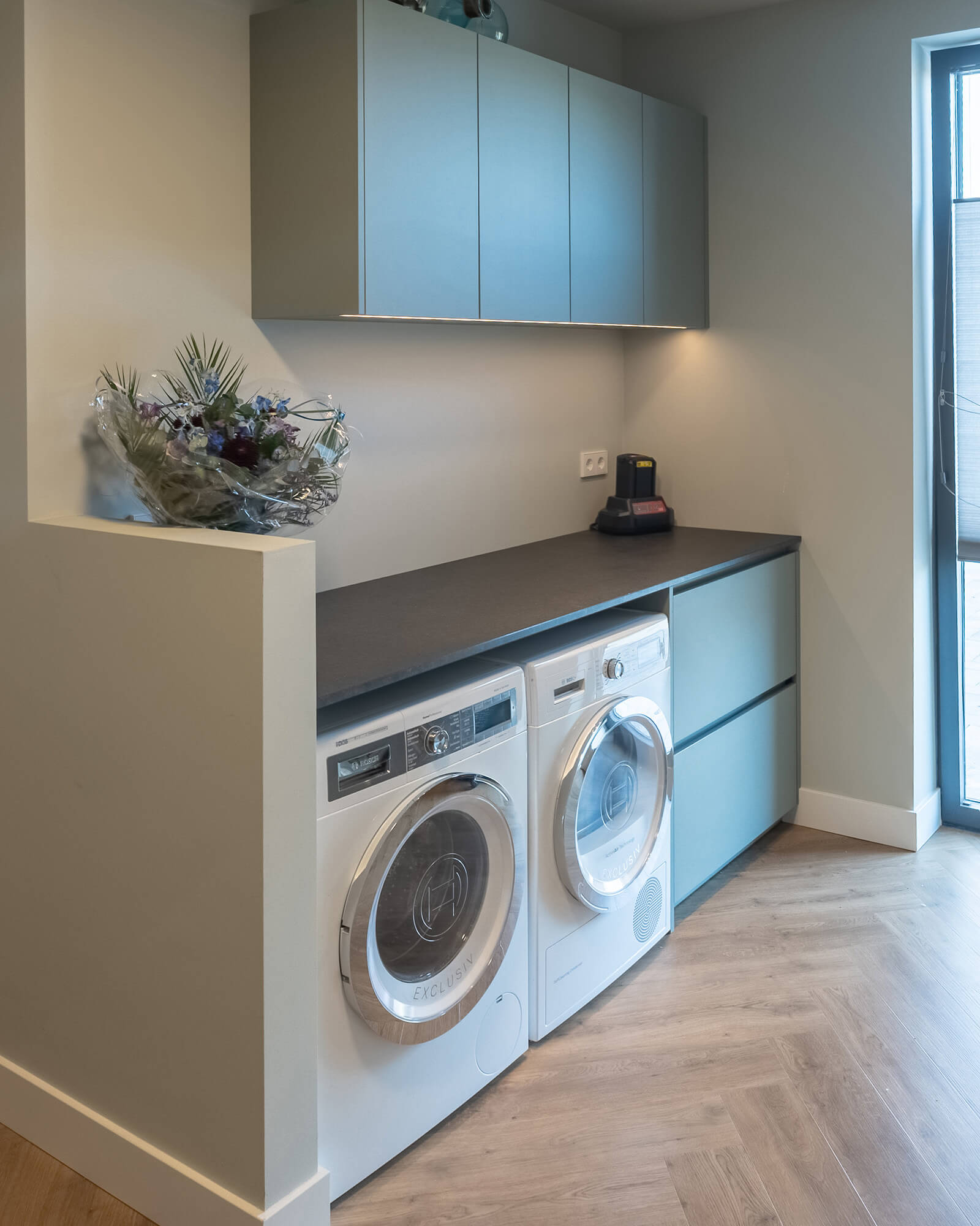 De ruime bijkeuken in deze woning is helemaal op maat gemaakt en bestaat uit drie delen: een hoge kastenwand, een deel voor de wasmachine en droger, en een spoelgedeelte. De kasten zijn gemaakt in het model Milano van Mereno, in een zachte grijstint (UB25 Ovatta) met donkere binnenkant. Het werkblad en de stenen spoelbak zijn van Grillo in de kleur Nero Assoluto Anticato: sterk, donker en makkelijk in onderhoud. In de kastenwand is een V-ZUG Refresh Butler ingebouwd.