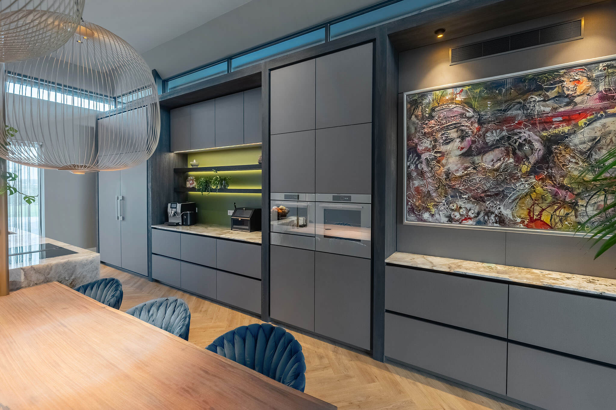 Deze keuken is opgezet als een doordacht totaalconcept waarin rust en contrast elkaar versterken. De hoge kastenwand vormt de neutrale basis, uitgevoerd in zachte grijstinten met greeploze fronten en afgeronde hoeken. Die ingetogen basis laat opvallende elementen als het goudkleurige RVS-frame op het kookeiland, de houten eettafel en de groene Bokmerk achterwand in de koffienis extra uitkomen. Samen met de kunstnis en het royale werkblad ontstaat er een gelaagd ontwerp.