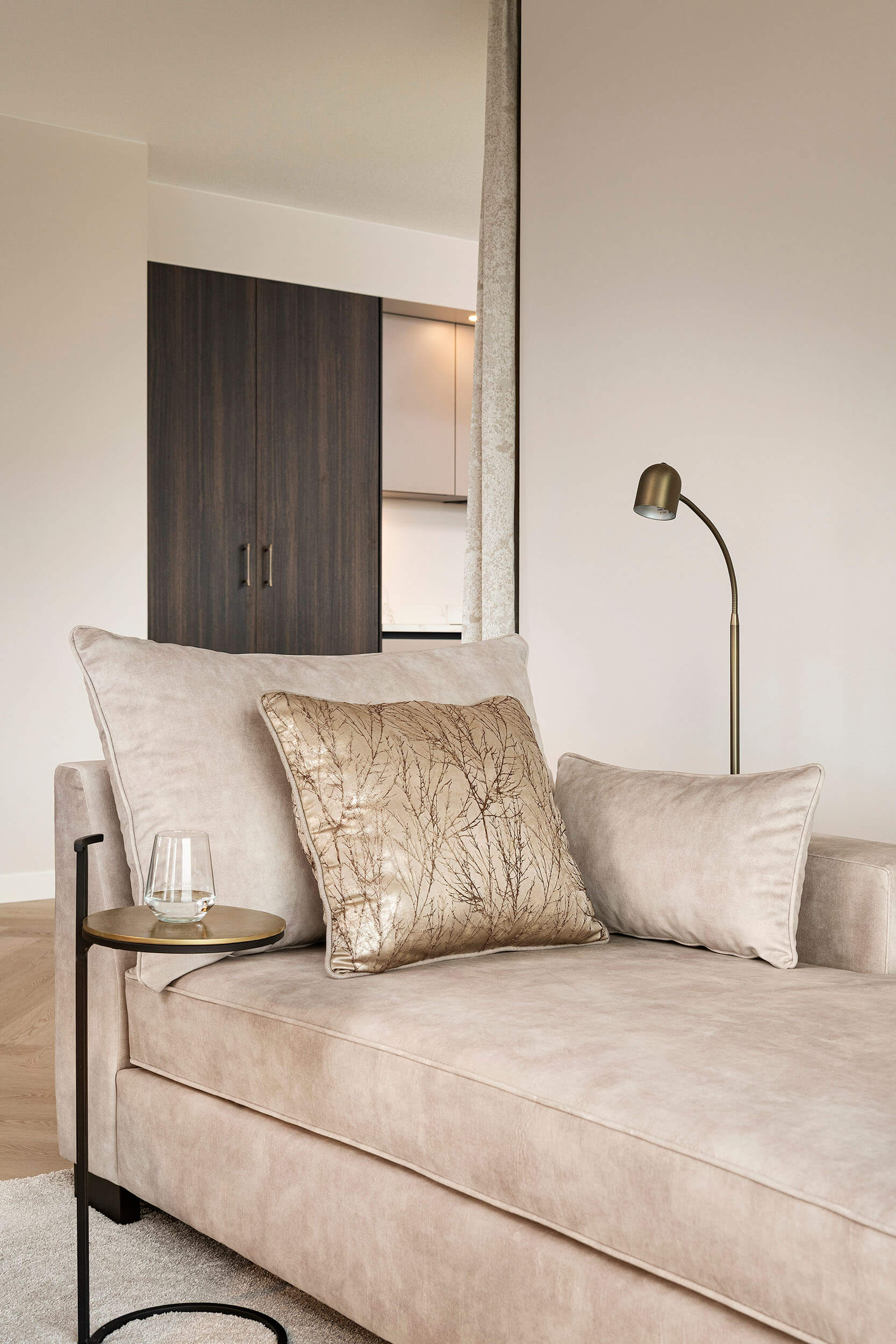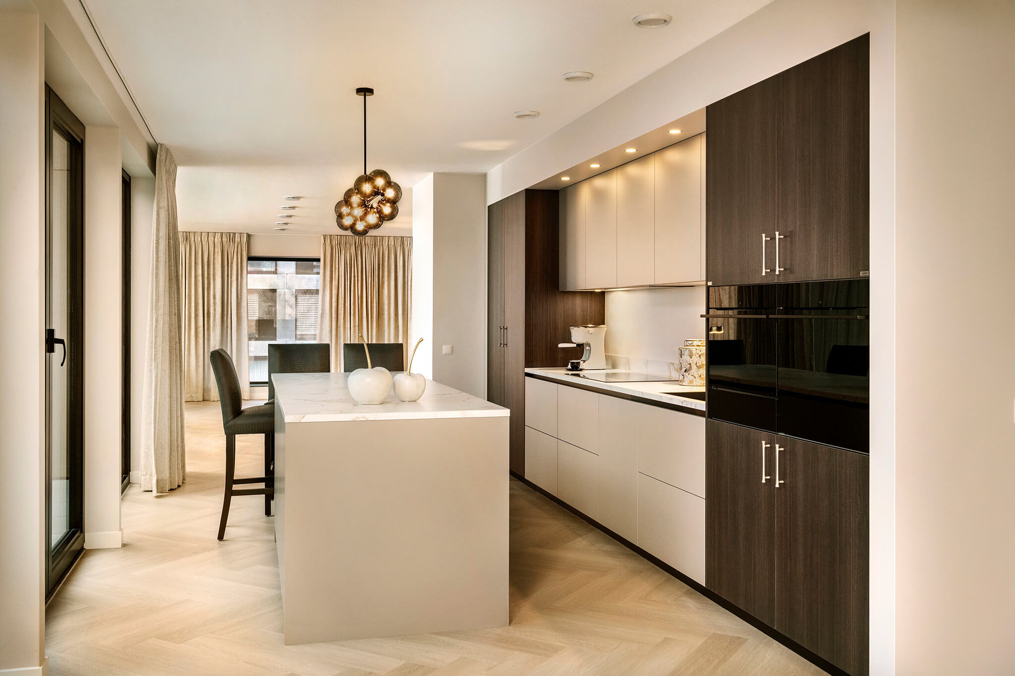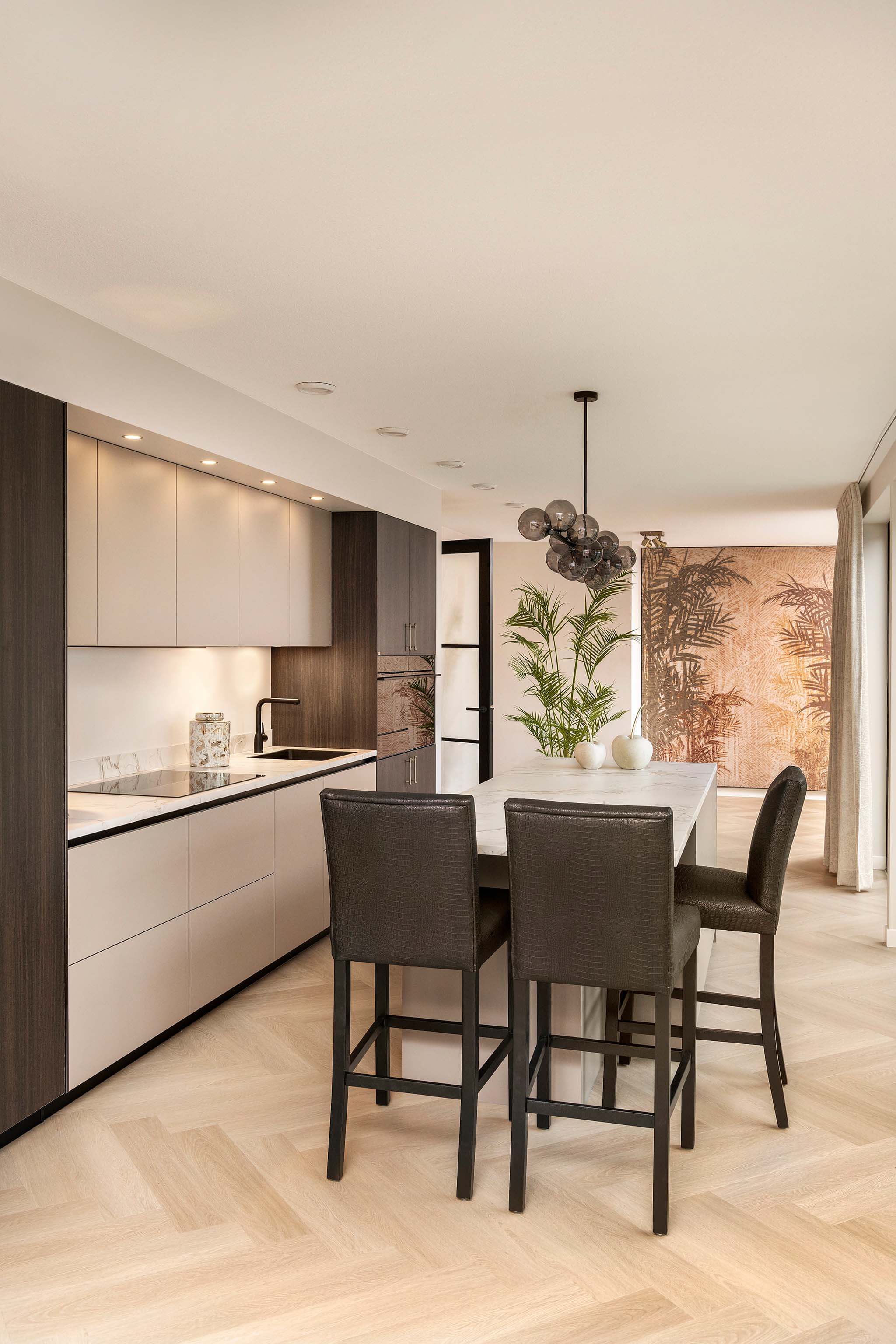Bij dit project kreeg Maison Sucre de volledige vrijheid om een droominterieur te creëren. Het penthouse was nog helemaal leeg en had zelfs nog geen keuken of sanitair. Interior designer Sharon Streuper verzorgde alles, van de verf tot de badkamers, waarbij een hoogwaardige keuken van Tieleman Keukens het middelpunt vormt van de woning. Door de samenwerking tussen Sharon en onze adviseurs sluit de keuken naadloos aan bij de rest van de woning.