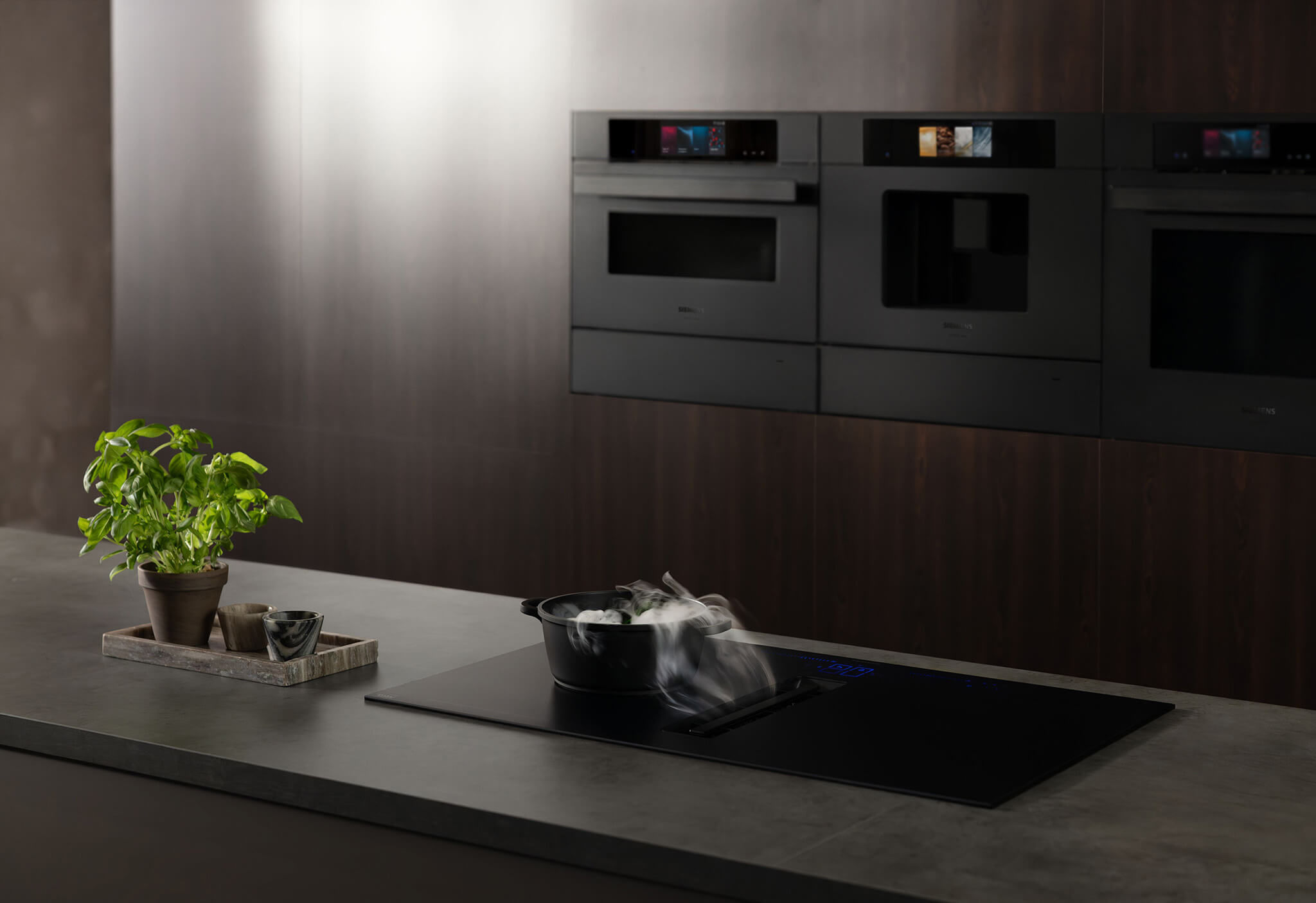 Voor een keuken die volledig in balans is, kunt u de matte stijl nog verder doorvoeren. De Siemens Matt Edition bevat namelijk ook afzuigkappen en de bekroonde iQ700-inductiekookplaat in een matzwarte uitvoering. Deze inductiekookplaat met ingebouwde afzuiging is door de Consumentenbond al negen keer op rij uitgeroepen tot ‘Beste uit de Test’. De apparaten sluiten naadloos op elkaar aan, wat zorgt voor een rustig en modern beeld in uw woning.
