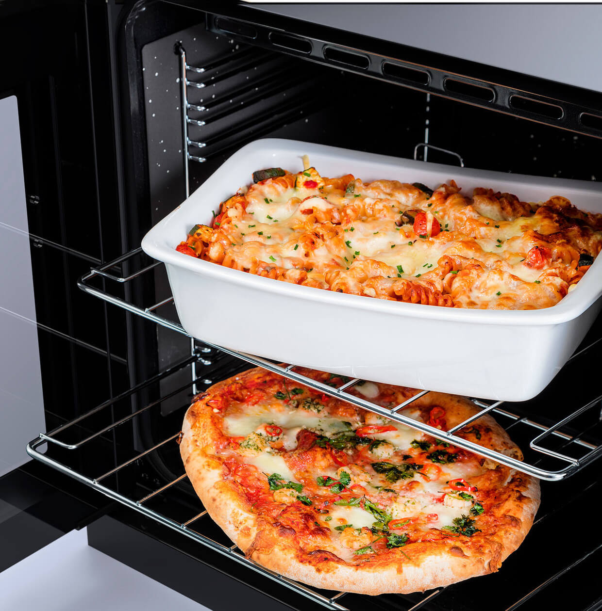 De linkeroven van 80 liter is een echte alleskunner. Dankzij het vernieuwde geleidesysteem schuift u bakplaten soepel in en uit, zelfs als de oven heet is. Ideaal voor meerdere gerechten tegelijk of grote ovenschotels.