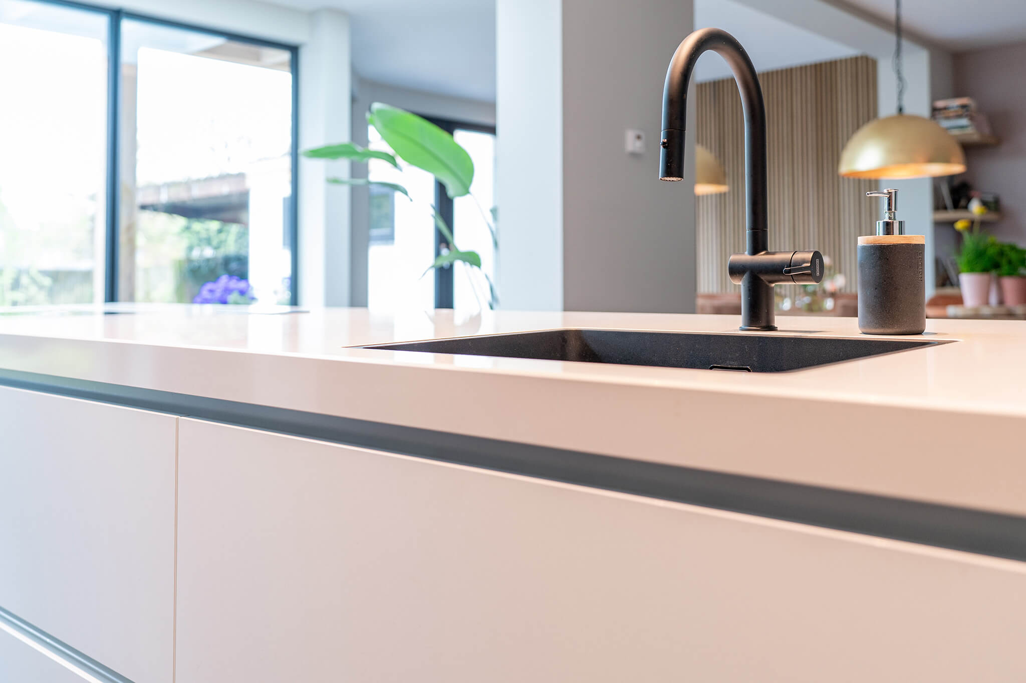 Met apparatuur van Bosch en een Bora kookplaat met ingebouwde afzuiging is koken in deze keuken een feest. De zwarte kraan met uittrekbare uitloop en de matte spoelbak sluiten perfect aan bij de rest van het ontwerp. Stijlvol én praktisch.