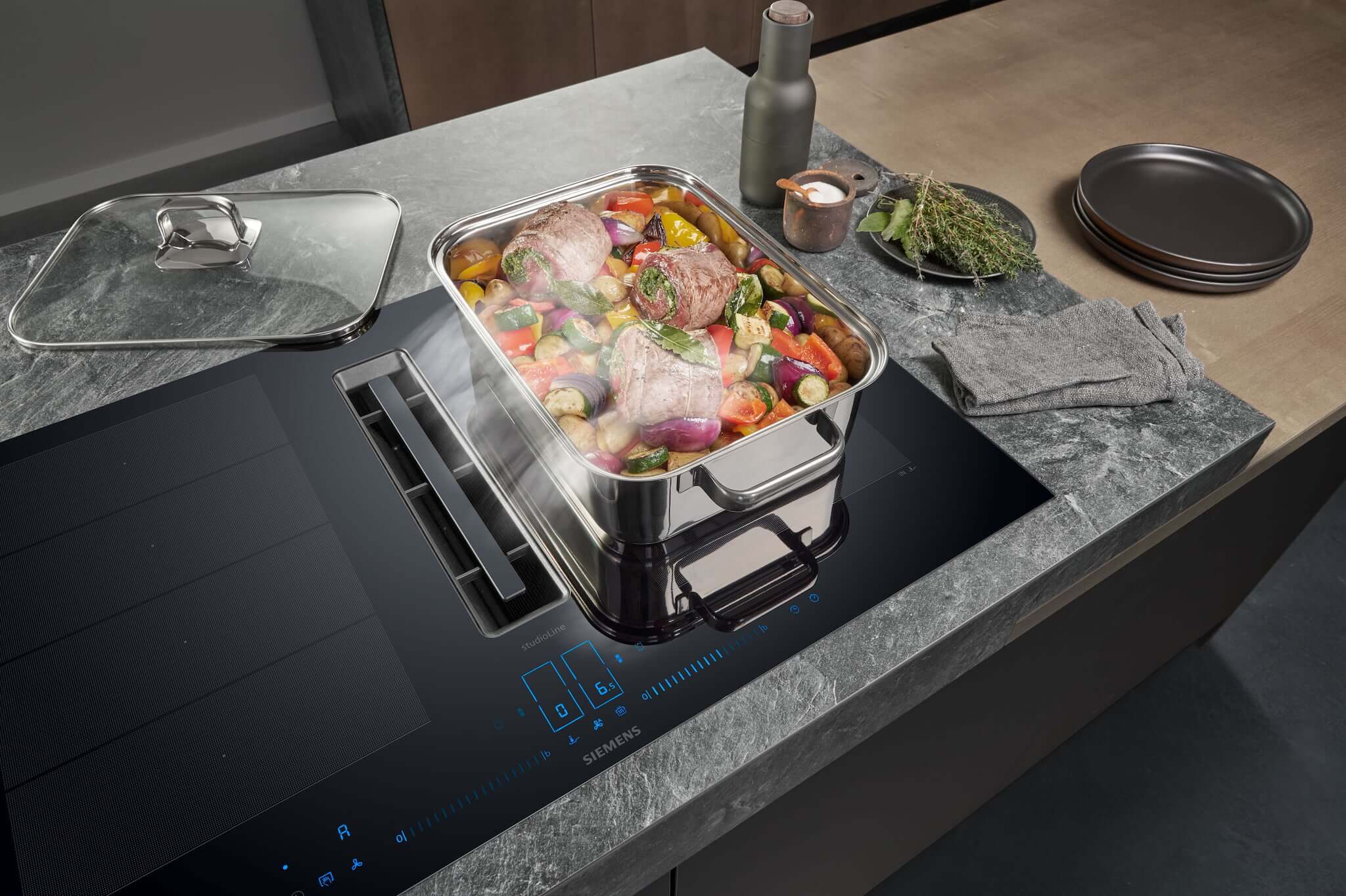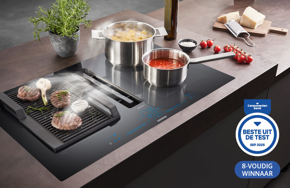 Zonder op te vallen, trekt hij toch de aandacht: de nieuwe matzwarte inductiekookplaat met afzuiging van Siemens. Niet alleen vanwege het strakke uitstraling, maar ook vanwege de stille kracht en het gebruiksgemak. Deze kookplaat is de nieuwste variant van een al acht keer als Beste uit de Test bekroond model. Nu te zien én te ervaren tijdens de kookdemonstraties.