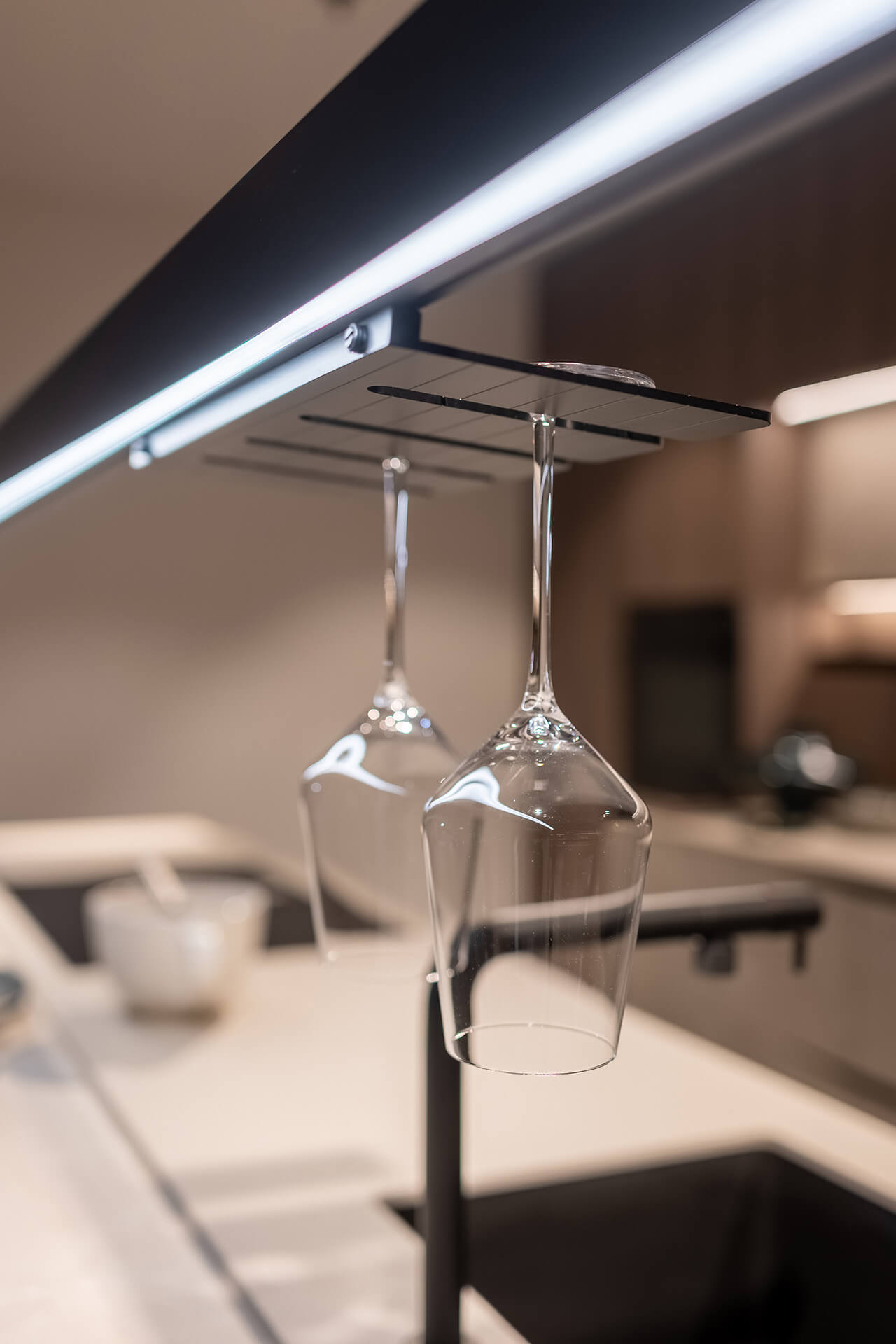 Boven het eiland ziet u de Tibetus: een licht en stijlvol rek van zwart aluminium. Dit systeem hangt als een moderne brug boven het werkblad en is voorzien van zachte verlichting. Hierdoor heeft u altijd goed zicht tijdens het snijden en koken. U kunt er gemakkelijk verschillende haken en accessoires aan bevestigen. Zo hangt uw belangrijkste keukengerei altijd binnen handbereik!