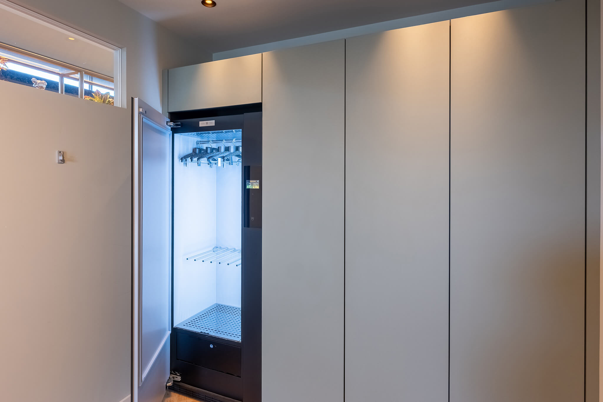 De ruime bijkeuken in deze woning is helemaal op maat gemaakt en bestaat uit drie delen: een hoge kastenwand, een deel voor de wasmachine en droger, en een spoelgedeelte. De kasten zijn gemaakt in het model Milano van Mereno, in een zachte grijstint (UB25 Ovatta) met donkere binnenkant. Het werkblad en de stenen spoelbak zijn van Grillo in de kleur Nero Assoluto Anticato: sterk, donker en makkelijk in onderhoud. In de kastenwand is een V-ZUG Refresh Butler ingebouwd.
