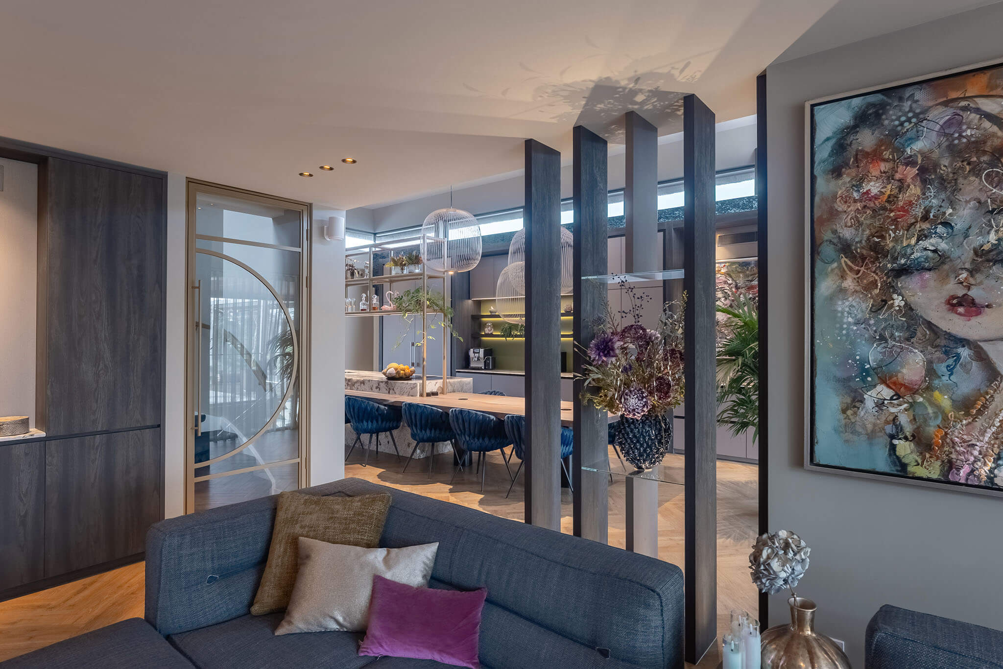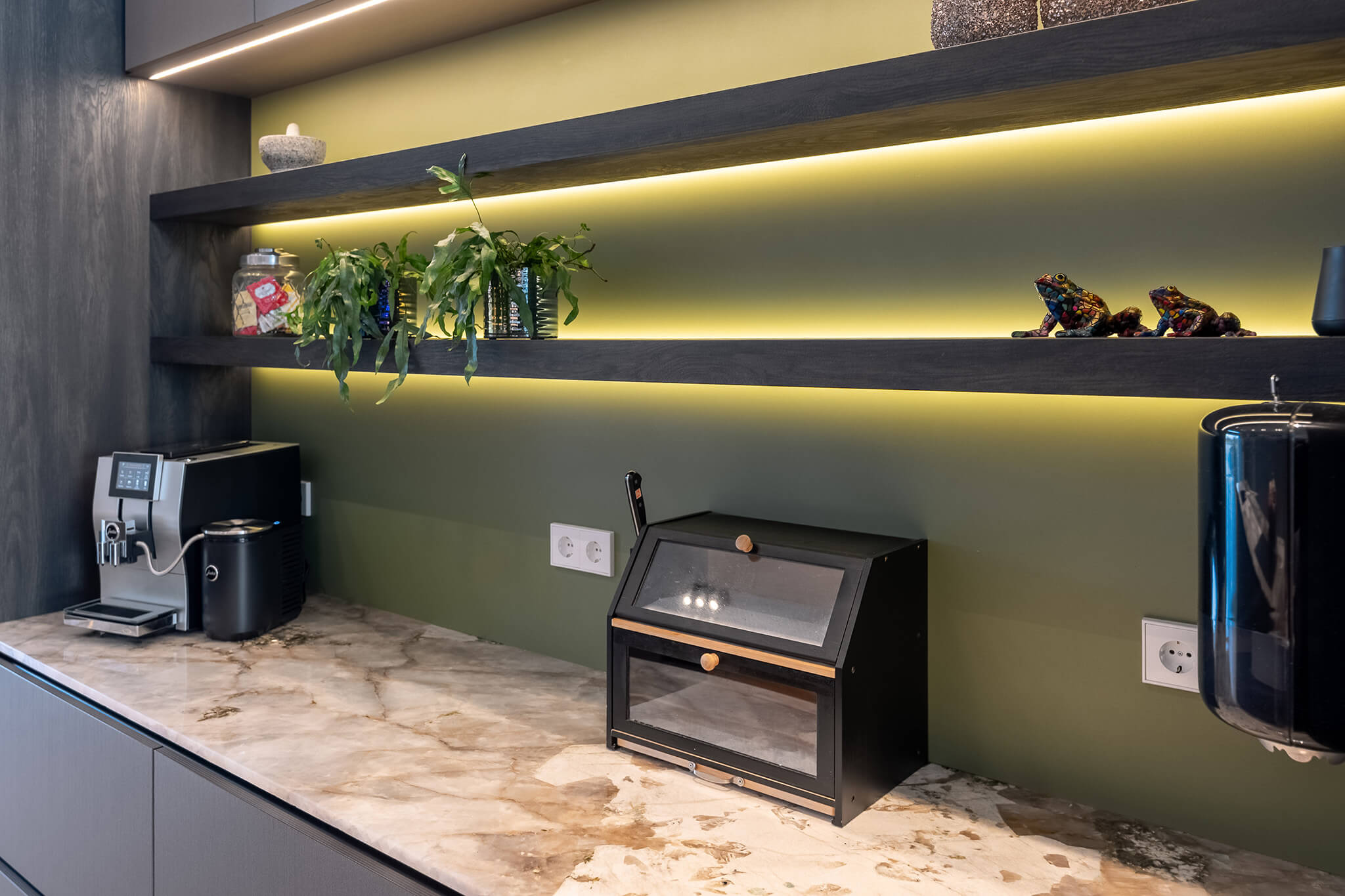 Deze keuken is opgezet als een doordacht totaalconcept waarin rust en contrast elkaar versterken. De hoge kastenwand vormt de neutrale basis, uitgevoerd in zachte grijstinten met greeploze fronten en afgeronde hoeken. Die ingetogen basis laat opvallende elementen als het goudkleurige RVS-frame op het kookeiland, de houten eettafel en de groene Bokmerk achterwand in de koffienis extra uitkomen. Samen met de kunstnis en het royale werkblad ontstaat er een gelaagd ontwerp.