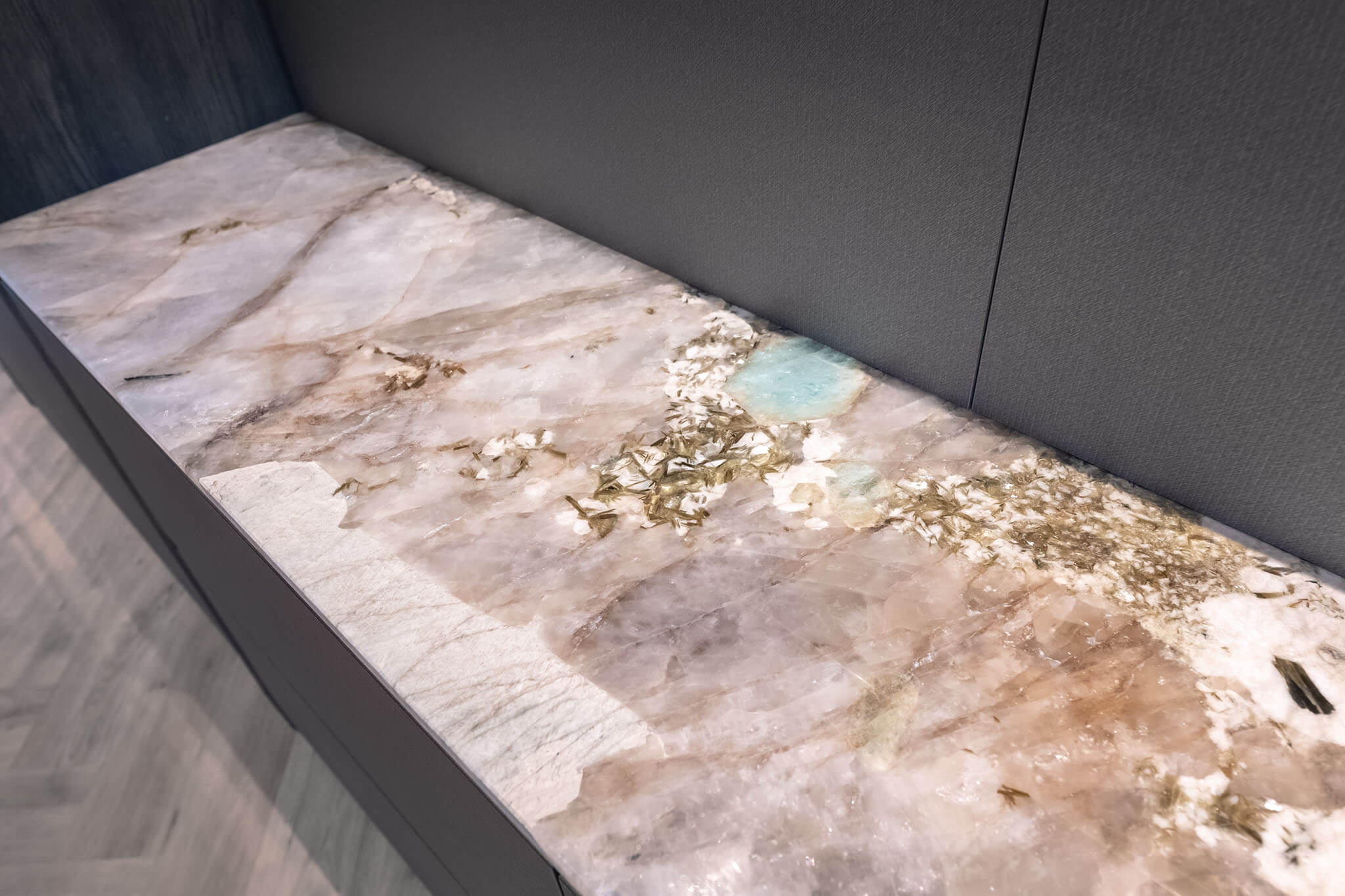 Het kook- en spoeleiland met geïntegreerde houten eettafel vormt het hart van de ruimte. De grijze kleur van de fronten zorgt samen met de Grillo werkbladen voor een warme, luxe sfeer. Apparatuur van merken als Bora, V-ZUG en Liebherr maken de keuken compleet. De ruimte is ontworpen om te verbinden: er is plek voor acht personen aan tafel, zonder dat het ten koste gaat van het kookcomfort.