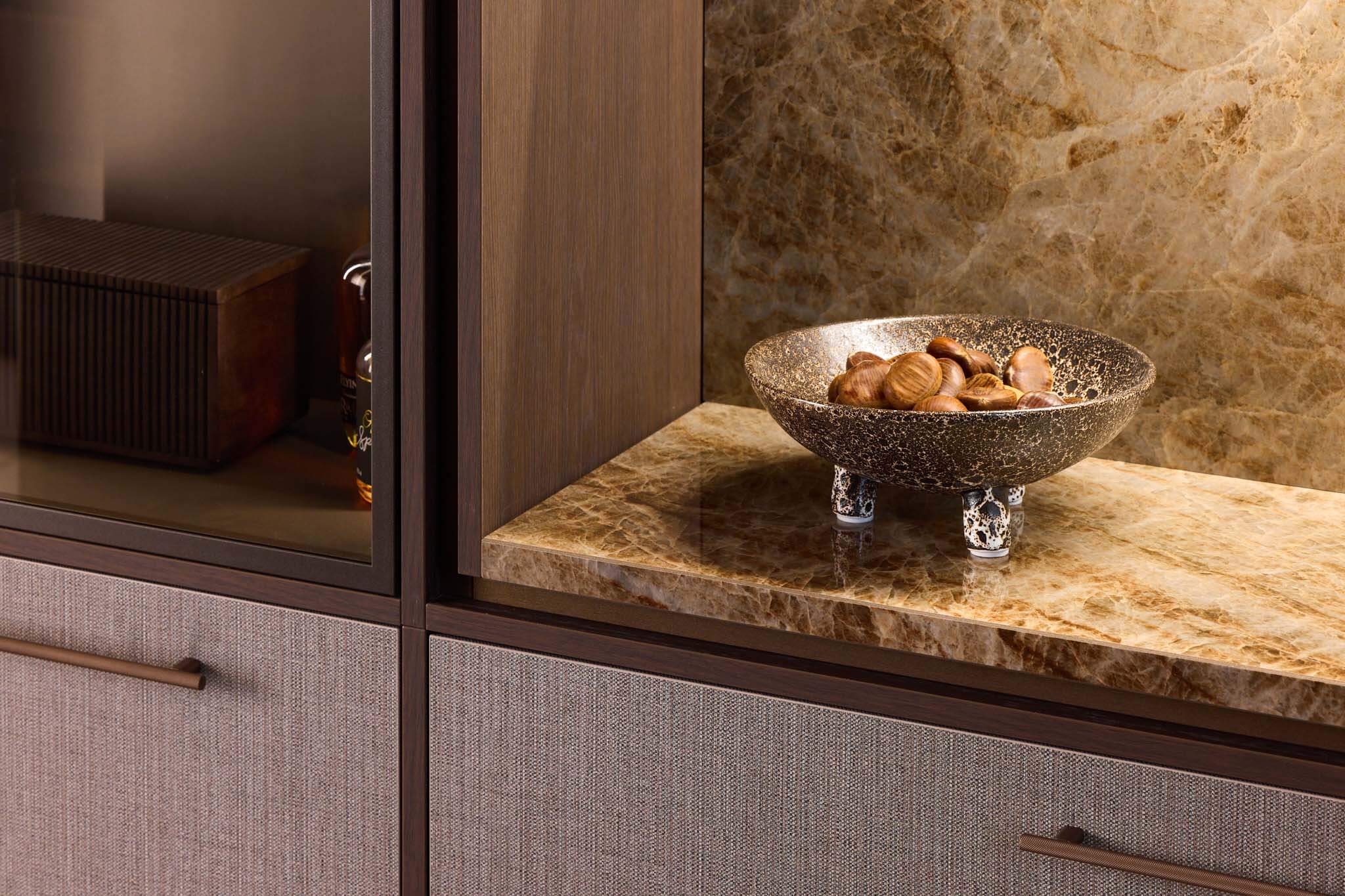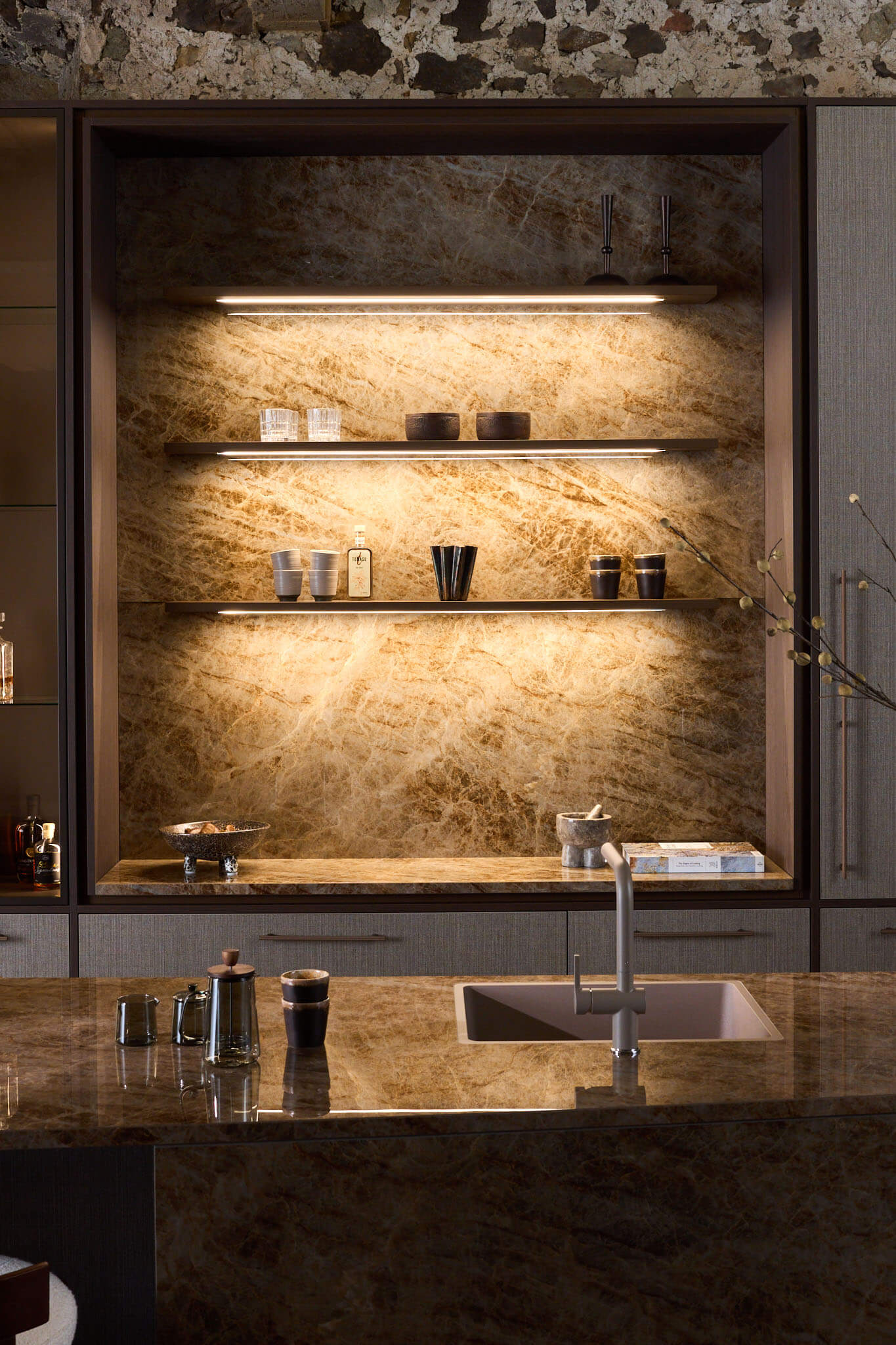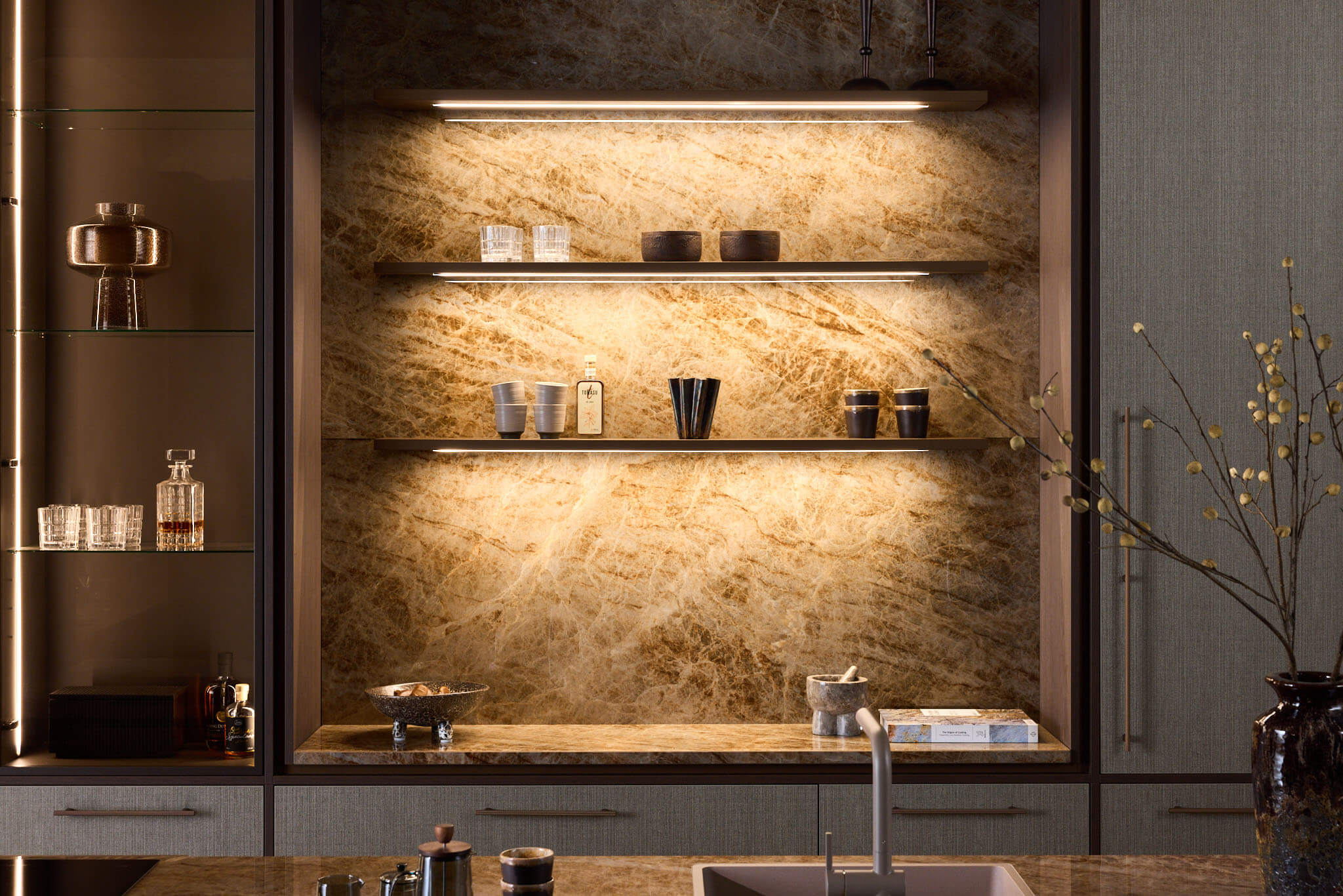 In de open nis ziet u sfeervolle verlichting en achterwanden met een rijke steenlook. Hier is plek voor uw mooiste servies of een koffiemachine. De stijlvolle glaskast met slanke profielen en ingebouwde verlichting geeft uw mooiste glazen een podium en maakt het plaatje compleet. Het geheel straalt pure luxe uit.