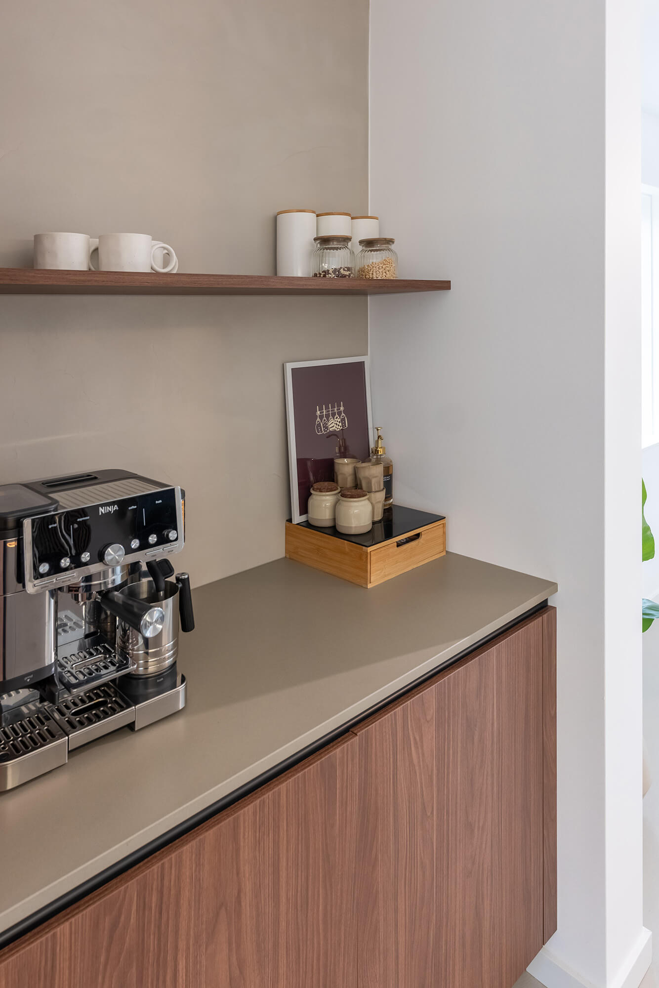 De verticale walnoothouten kasten en de ultra matte fronten maken deze Tieleman-keuken uniek. Het dunne aanrechtblad van Dekker in de kleur Easy Terni Honed ziet er niet alleen mooi uit, het voelt ook heel natuurlijk aan. De kracht zit in de details. Rondom het eiland hebben we verlichte greeplijsten geplaatst. Zodra de avond valt, geeft dit een prachtige gloed door de ruimte!