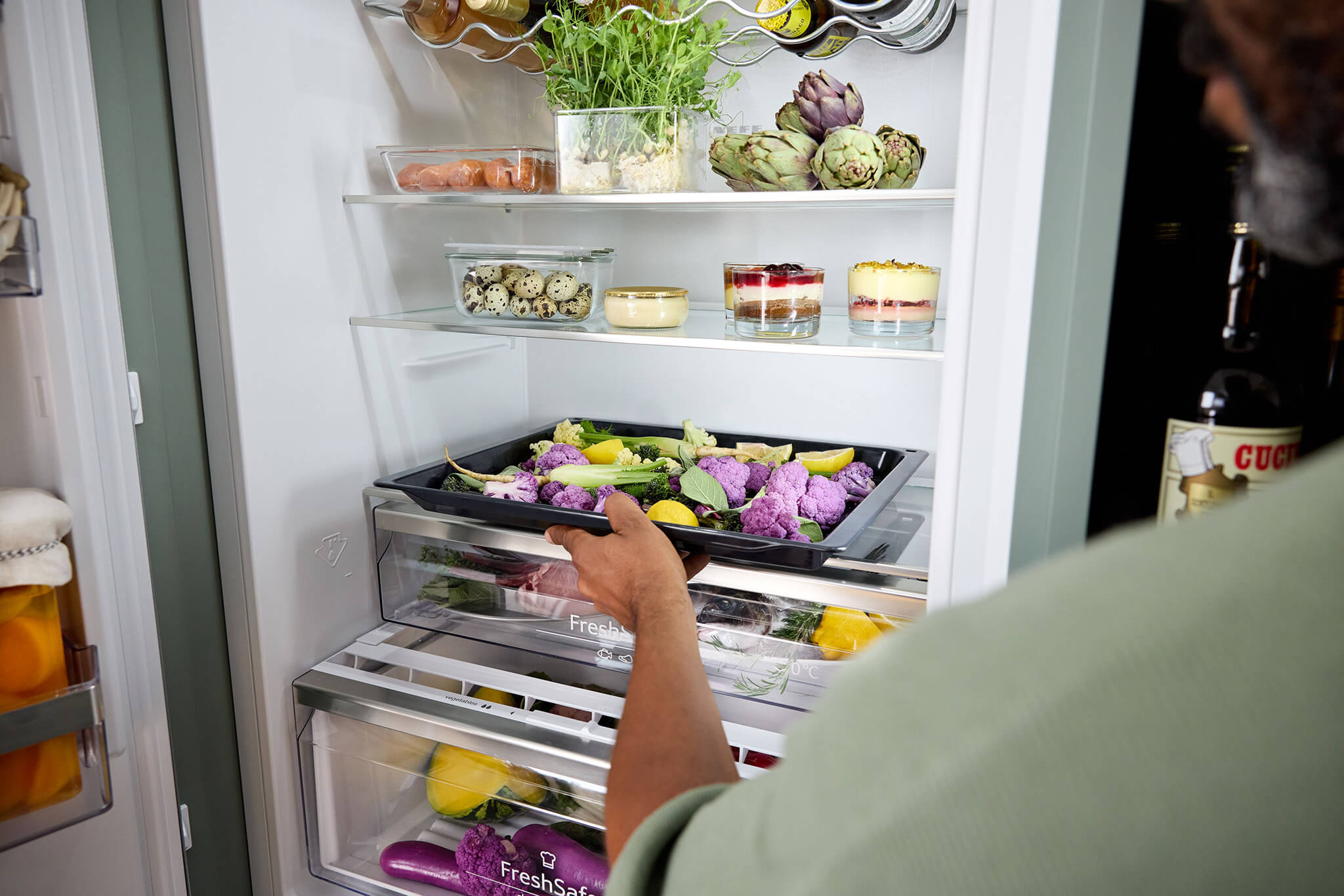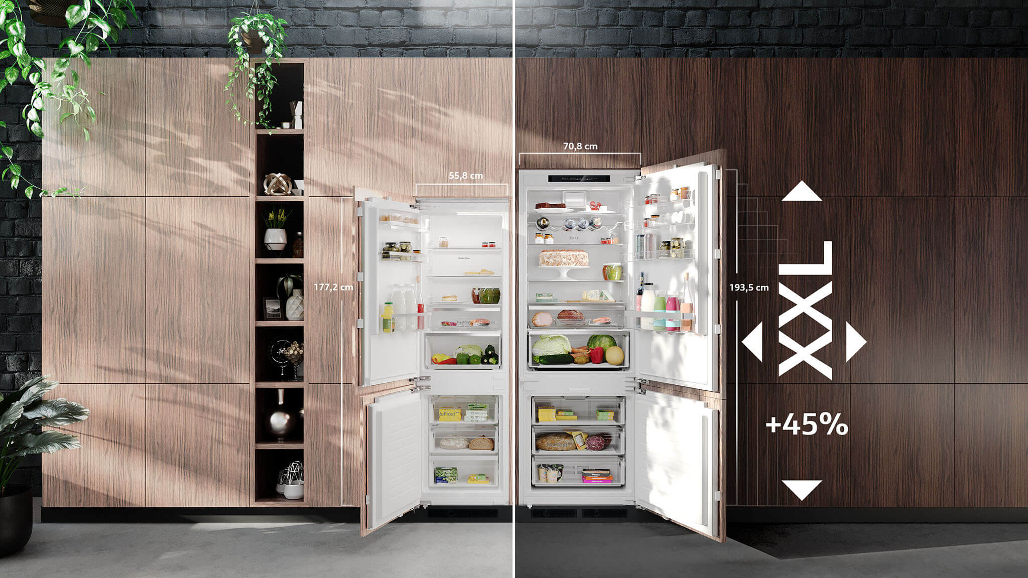De XL en XXL koel-vriescombinaties creëren op slimme wijze meer plek voor al uw eten en drinken. Met de XL variant krijgt u 11 procent meer ruimte vergeleken met een standaard model. Zoekt u echt het maximale volume? De XXL variant heeft maar liefst 45 procent extra ruimte. Of u nu hoge taarten, grote verpakkingen of een hele watermeloen wilt bewaren, alles krijgt moeiteloos een eigen plek. Zelfs een volledige bakplaat schuift u zonder problemen naar binnen in deze ruime koelkast.
