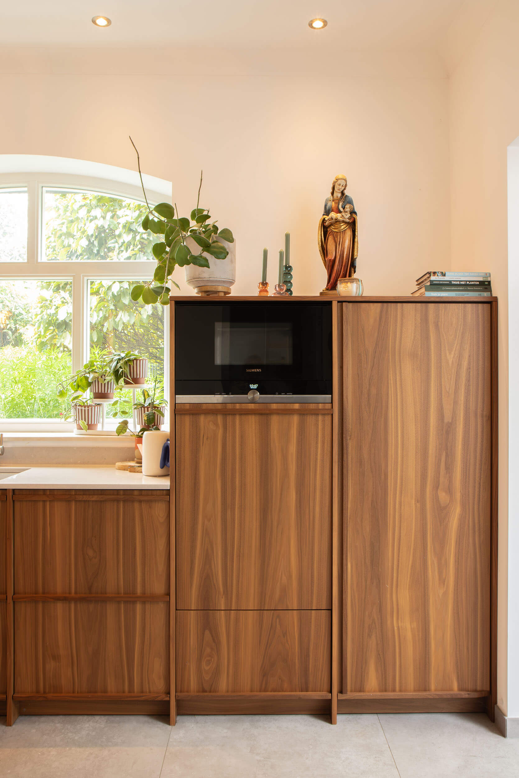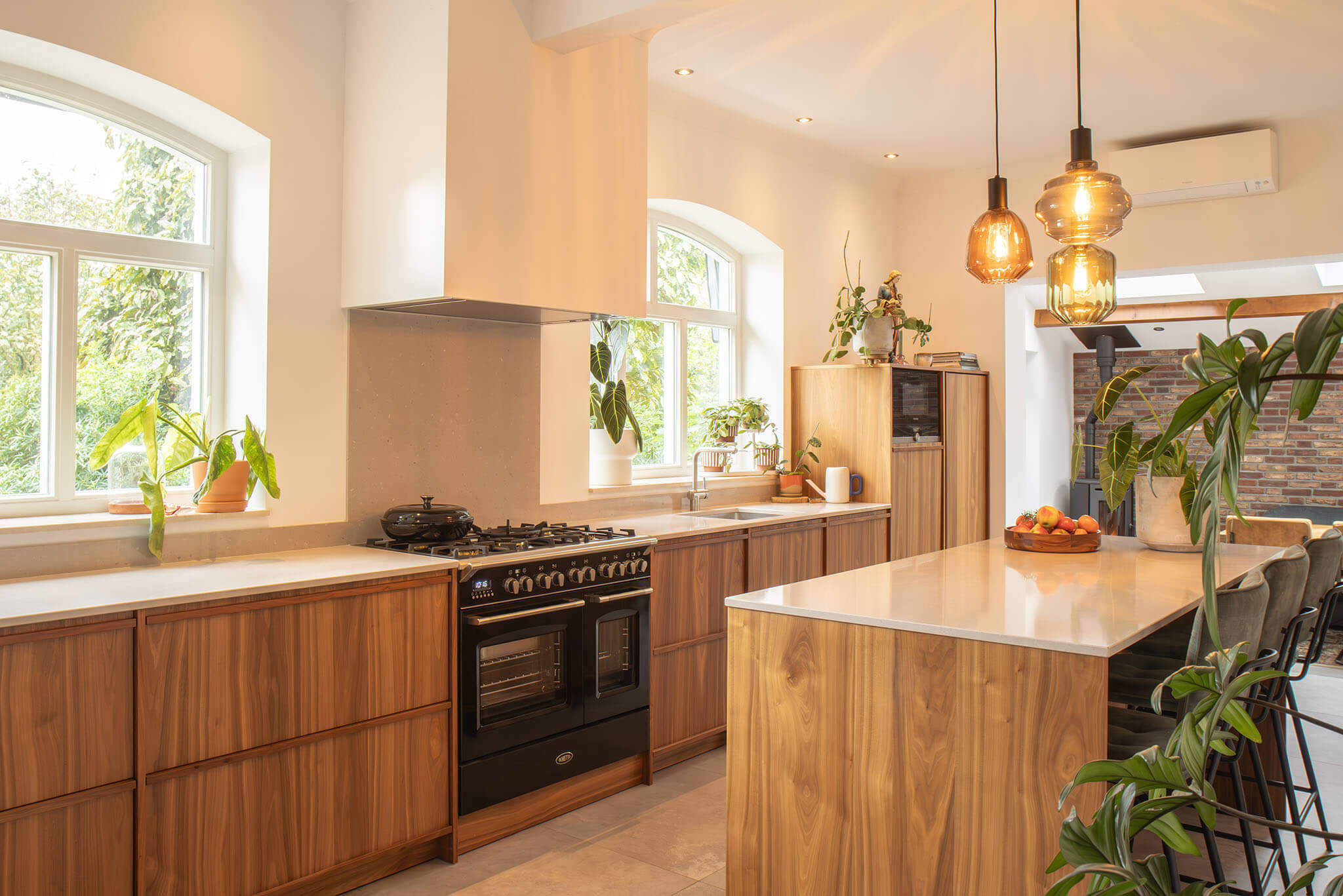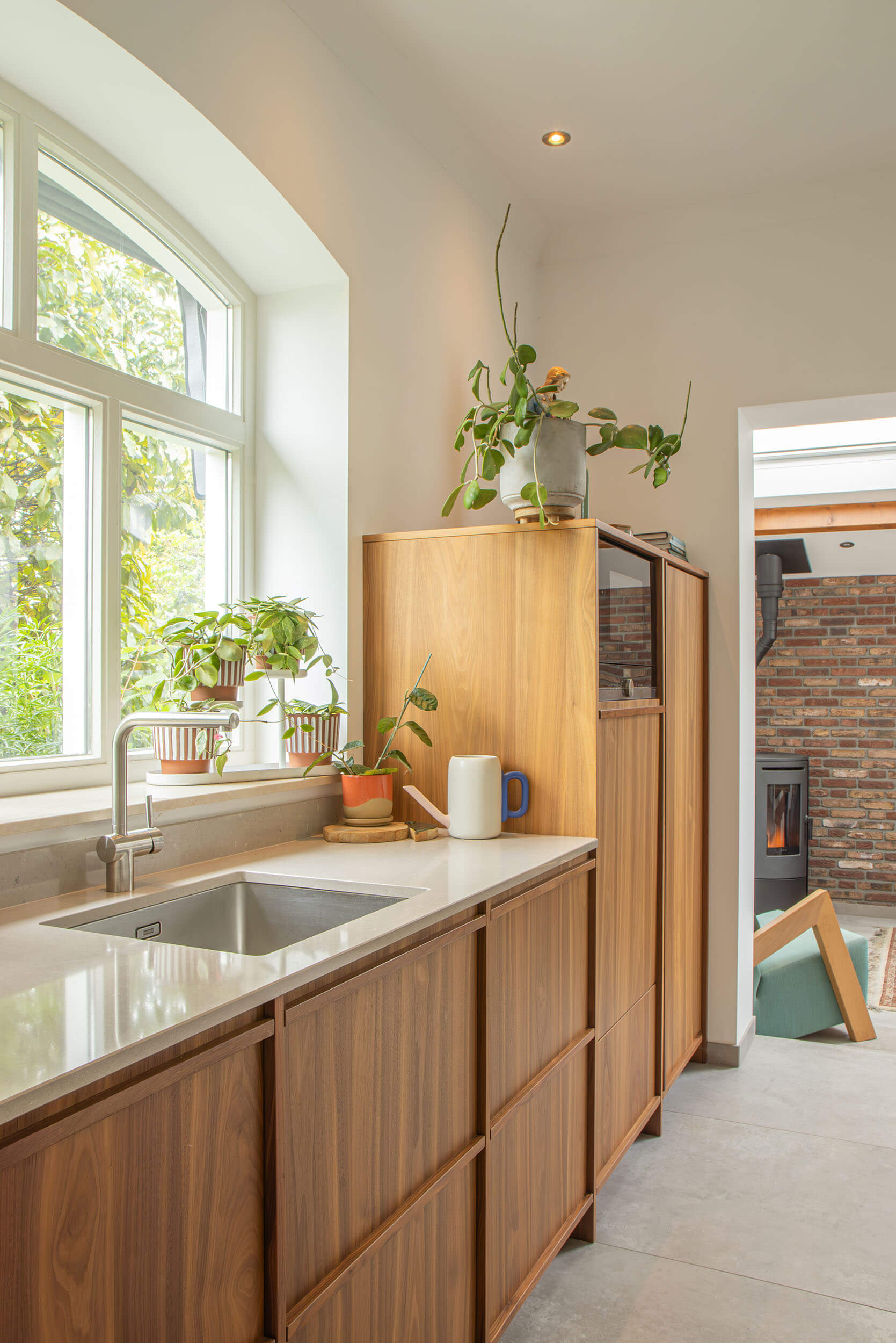 Wat deze ruimte zo bijzonder maakt, is de combinatie van het strakke notenfineer met de authentieke elementen van het huis. De wit gestuukte muren en de klassieke raampartijen laten veel daglicht binnen, waardoor het werkblad van Arte nog mooier tot zijn recht komt. De subtiele verlichting onder de koof en de warme gloed van de hanglampen maken de keuken ook in de avonduren tot een sfeervolle plek!