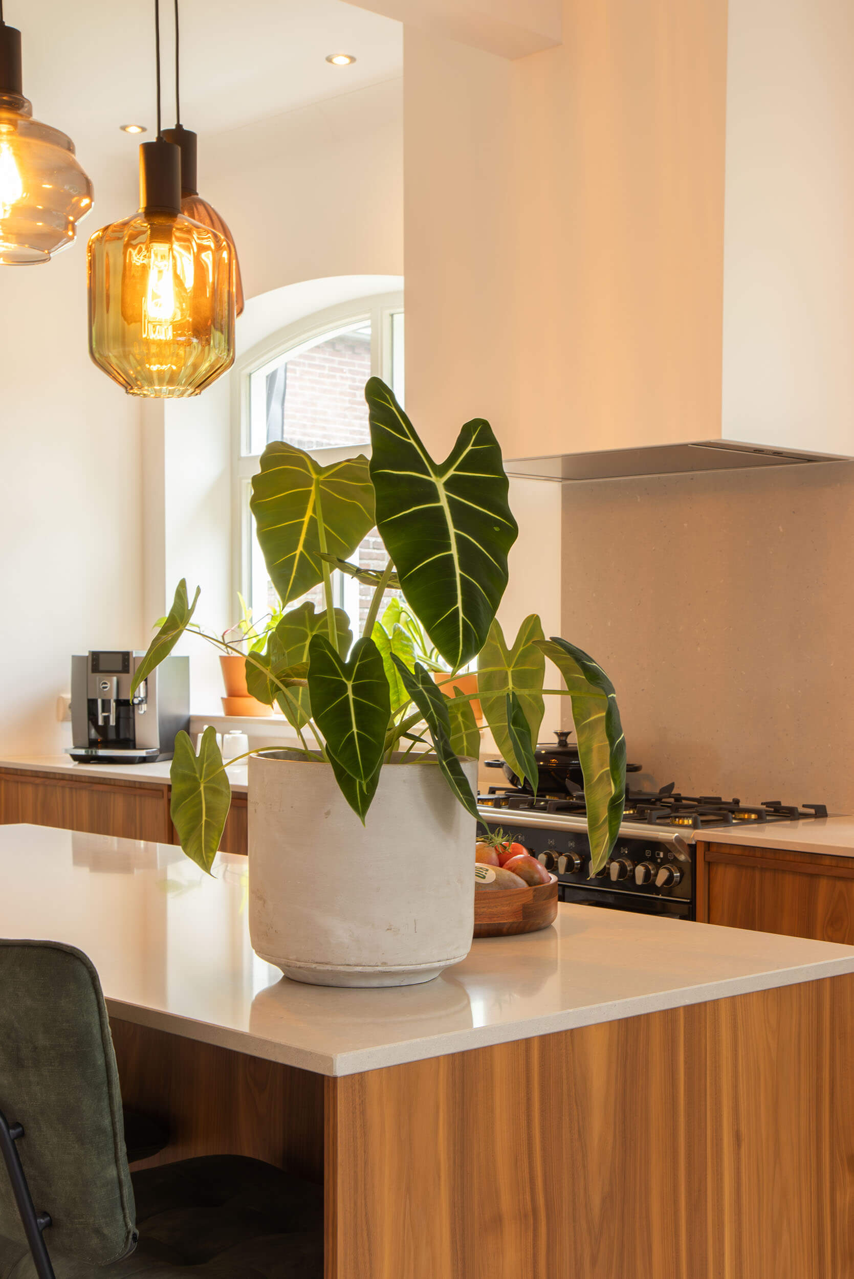 Het hart van de keuken is het ruime eiland. Hierop ligt een gepolijst keukenblad van Arte in de kleur Royal reef. Dit blad glanst mooi en past goed bij de warme houtkleur van het notenfineer. Aan het eiland is plek voor luxe barkrukken, waardoor u tijdens het koken gemakkelijk contact houdt met uw gezin of gasten. Grote planten en sfeervolle hanglampen boven het blad maken de styling compleet. Door de open indeling loopt de keuken prachtig over in de rest van de woonkamer.