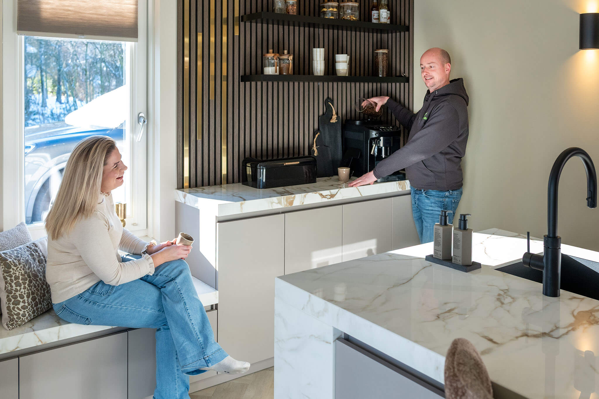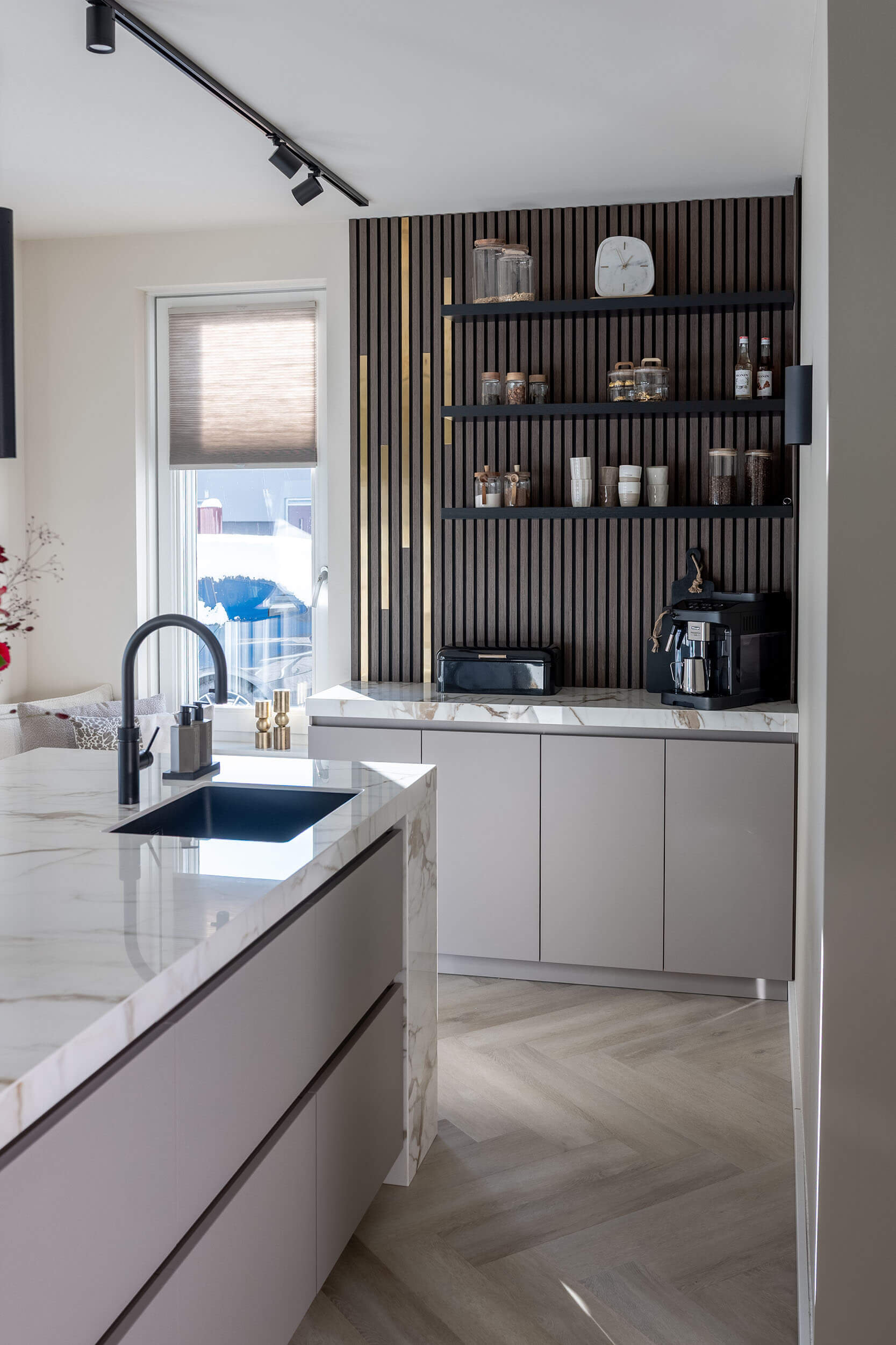 Naast een plek om te koken is deze Tieleman-keuken een echte leefruimte. In de kastenwand hebben we een sfeervolle koffienis gecreëerd. De houten latjes op de achterwand geven een warme touch aan het strakke design. Direct naast de keukenopstelling is een loungehoek bij het raam gemaakt. Hier kunnen de bewoners heerlijk zitten met een goed boek of een kop koffie!