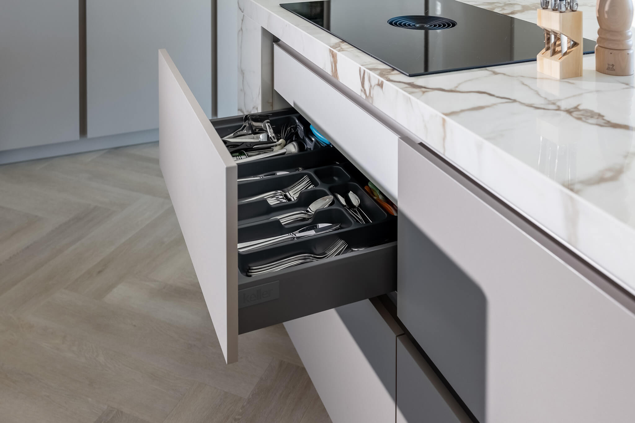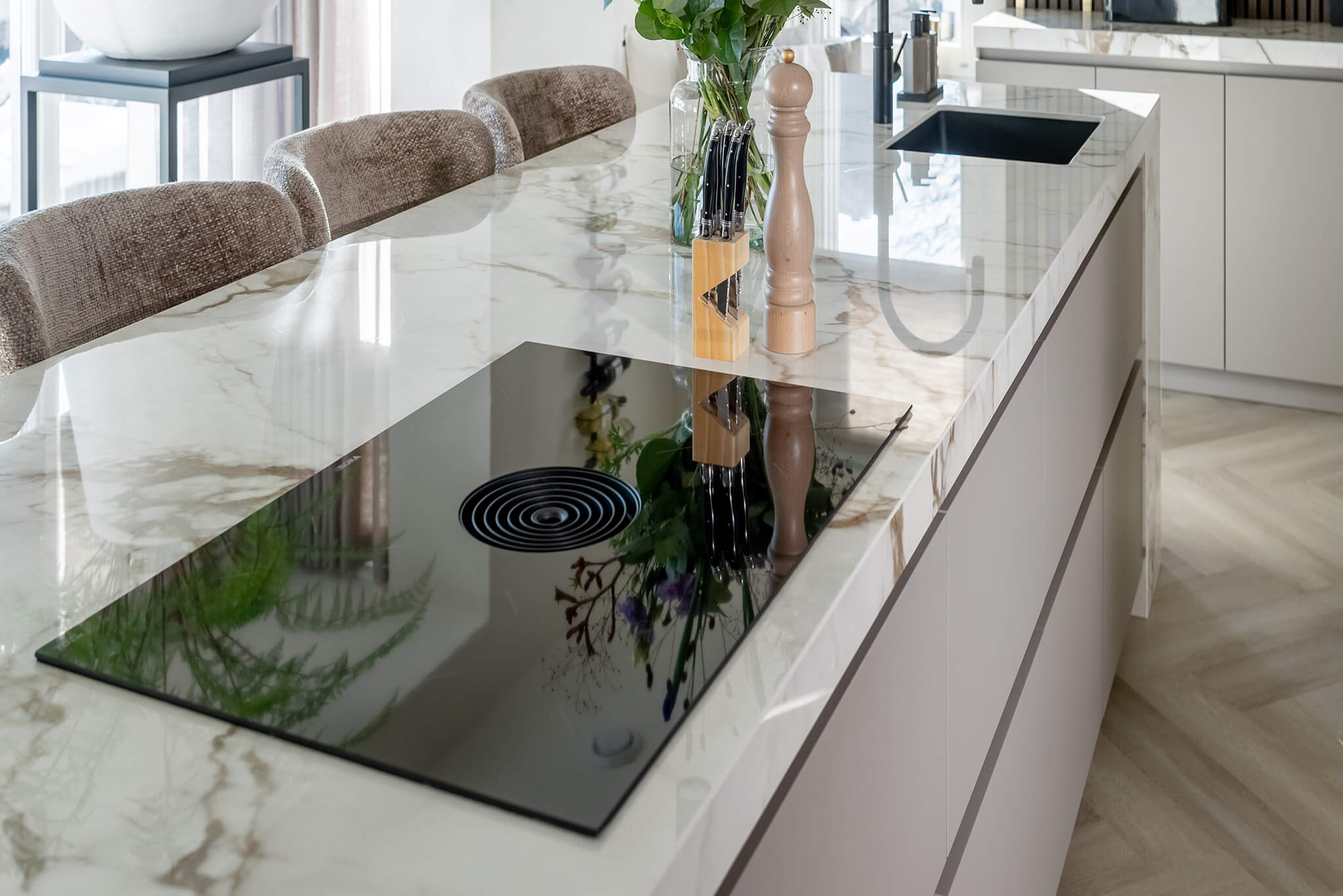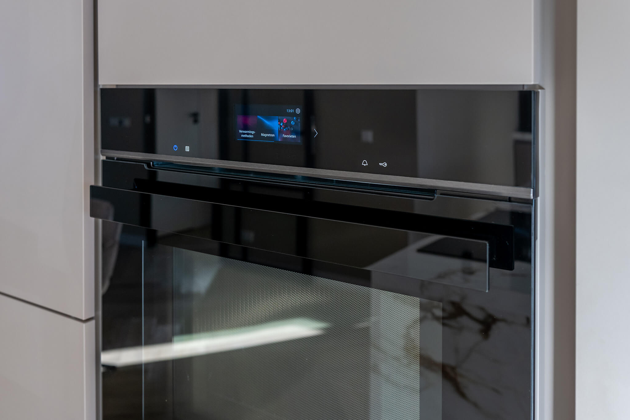 Een luxe keuken vraagt om de beste techniek. In het eiland is een kookplaat van Bora geplaatst die de kookdampen direct bij de bron afzuigt. Hierdoor blijft de ruimte vrij van een grote afzuigkap, wat bijdraagt aan de open sfeer in huis. De overige apparatuur is van het merk Siemens, met de oven op een centrale plek in de hoge kastenwand. Voor direct kokend water is de zwarte Quooker Combi+ Flex geplaatst. Zelfs aan de kleinste details is gedacht met een handige, ingebouwde stekkerdoos van Doeco in het aanrechtblad.