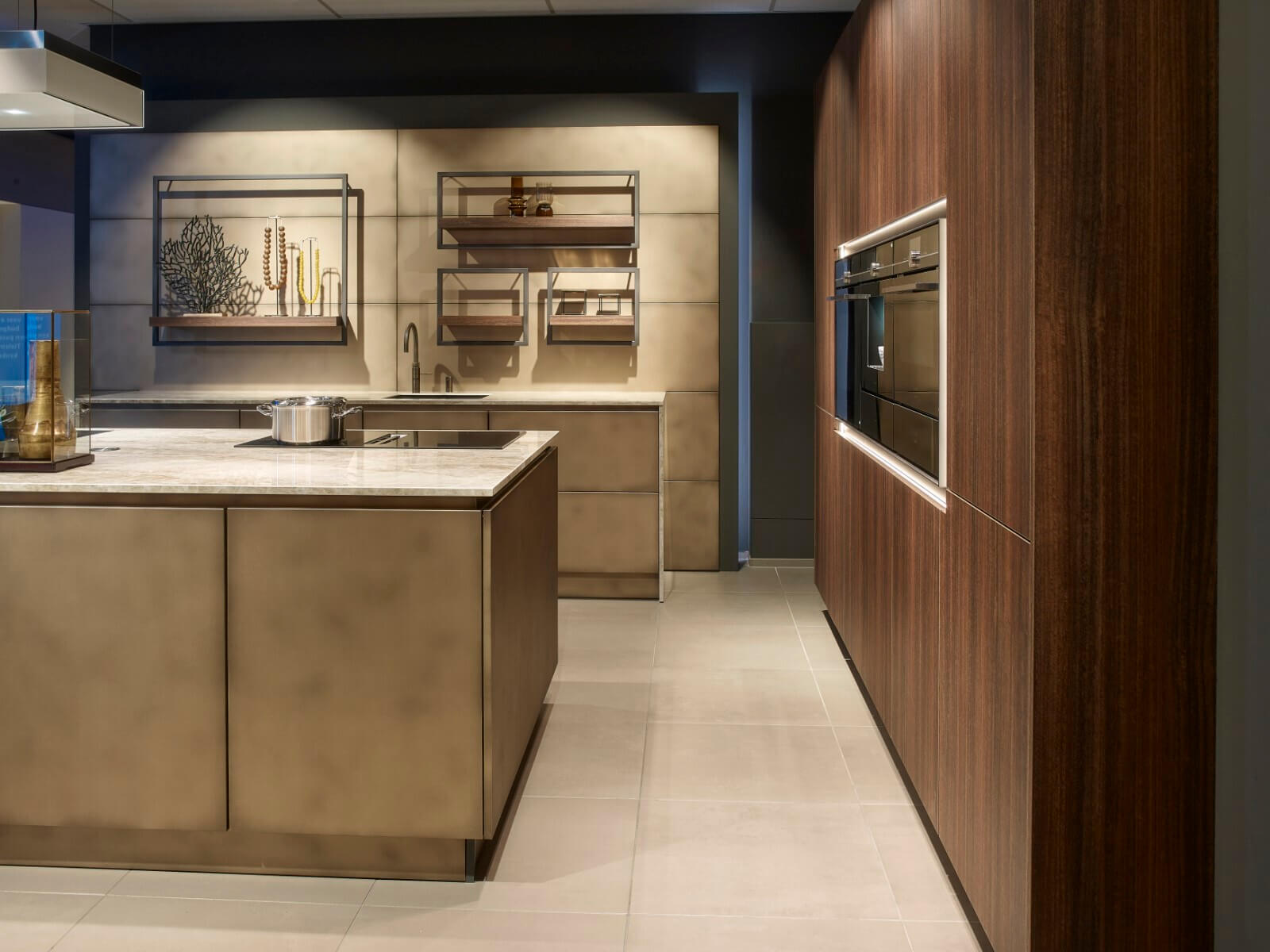 Nieuwe showroomkeuken uitgelicht: Tieleman Exclusief Mantua, versie Business Class met lak fronten in een bronskleur.