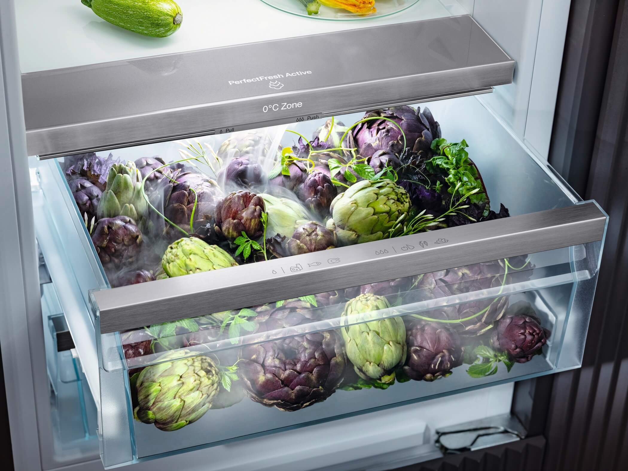 Een koelkast is een koelkast, maar in het assortiment koelkast is ook veel verschil. Zo hebben de koelkasten van Miele een speciaal systeem in de groenteladen: PerfectFresh en PerfectFresh Pro. Met het (automatisch geregelde) temperatuurbereik tussen de 0 tot 3 °C én de hoge luchtvochtigheid blijven groente en fruit drie tot vijf keer langer vers en vitaminen beter behouden.