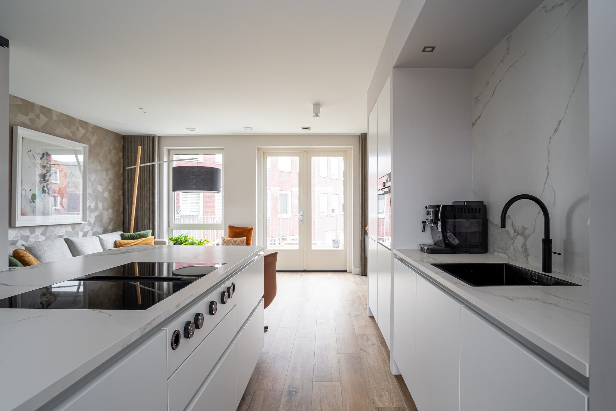 Voor het aanrechtblad is gekozen voor een Neolith blad van Arte. Het lichte blad past perfect bij de kristalwitte keuken. Het keukenblad heeft een levendige structuur waardoor ieder blad een uniek karakter heeft. Een Neolith aanrechtblad is hittebestendig, vlekbestendig, zuurbestendig en is bestand tegen krassen en slijtage. De achterwandbekleding boven het spoelgedeelte is van hetzelfde materiaal als het aanrechtblad.