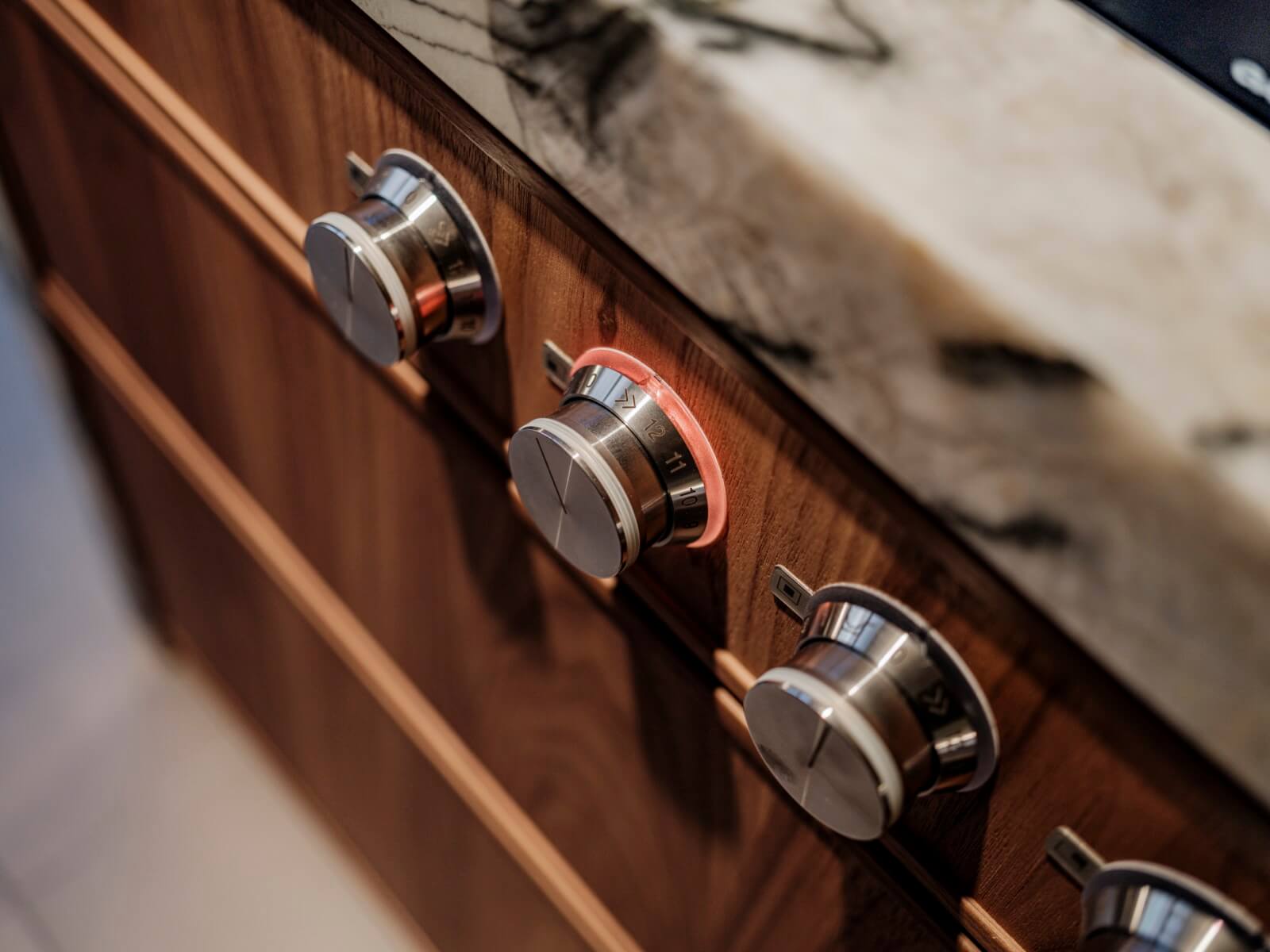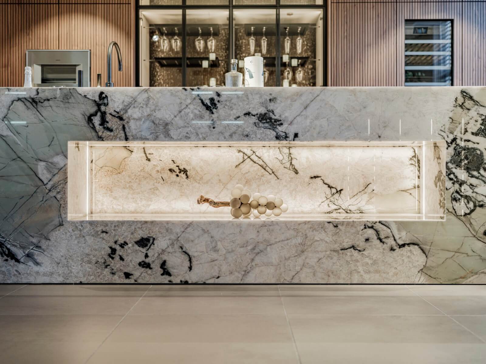 Het keukenblad van het kookeiland is een Grillo natuurstenen blad in marmerlook. Het eiland is voor het grootste gedeelte uitgevoerd in hetzelfde materiaal, zo ook de spoelbak. Een leuk detail is de verlichte nis aan de voorzijde van het eiland. De achterzijde van het kookeiland heeft gebeitste kader fronten in noten fineer.