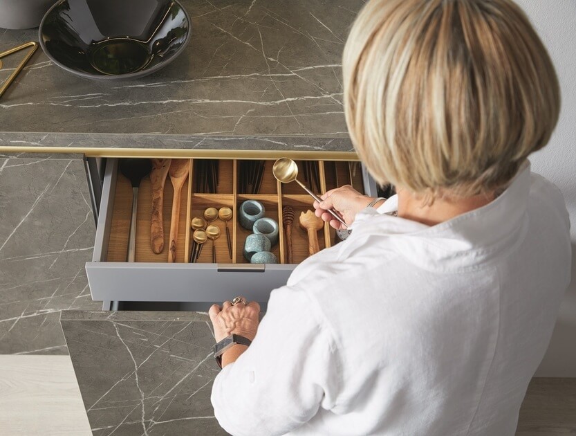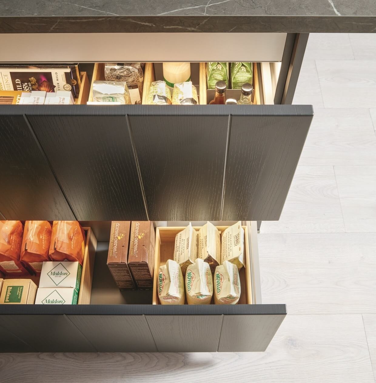 In deze keuken heb je alles wat je nodig hebt om van de keuken een centrale plek in je leven te maken. Veel ruimte, zodat je er met velen samen in kunt vertoeven, en veel opbergruimte, die dankzij de slimme binneninrichting optimaal wordt benut. Zo worden er bijvoorbeeld individueel aanpasbare houten bordenhouders en opbergboxen gebruikt – allemaal van eikenhout.