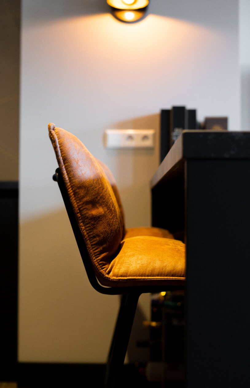 Greeploze Schüller Fino Matt keuken, uitgevoerd in de kleur onyxzwart. De aardse tinten die in de hoofdkeuken gebruikt zijn, zijn ook in de lounge/bar terug te vinden. In de woning is in de basis gekozen voor licht, maar in deze ruimte is juist voor de warmere aardse kleuren gekozen. Dit geeft de ruimte een extra gezellige en warme sfeer.