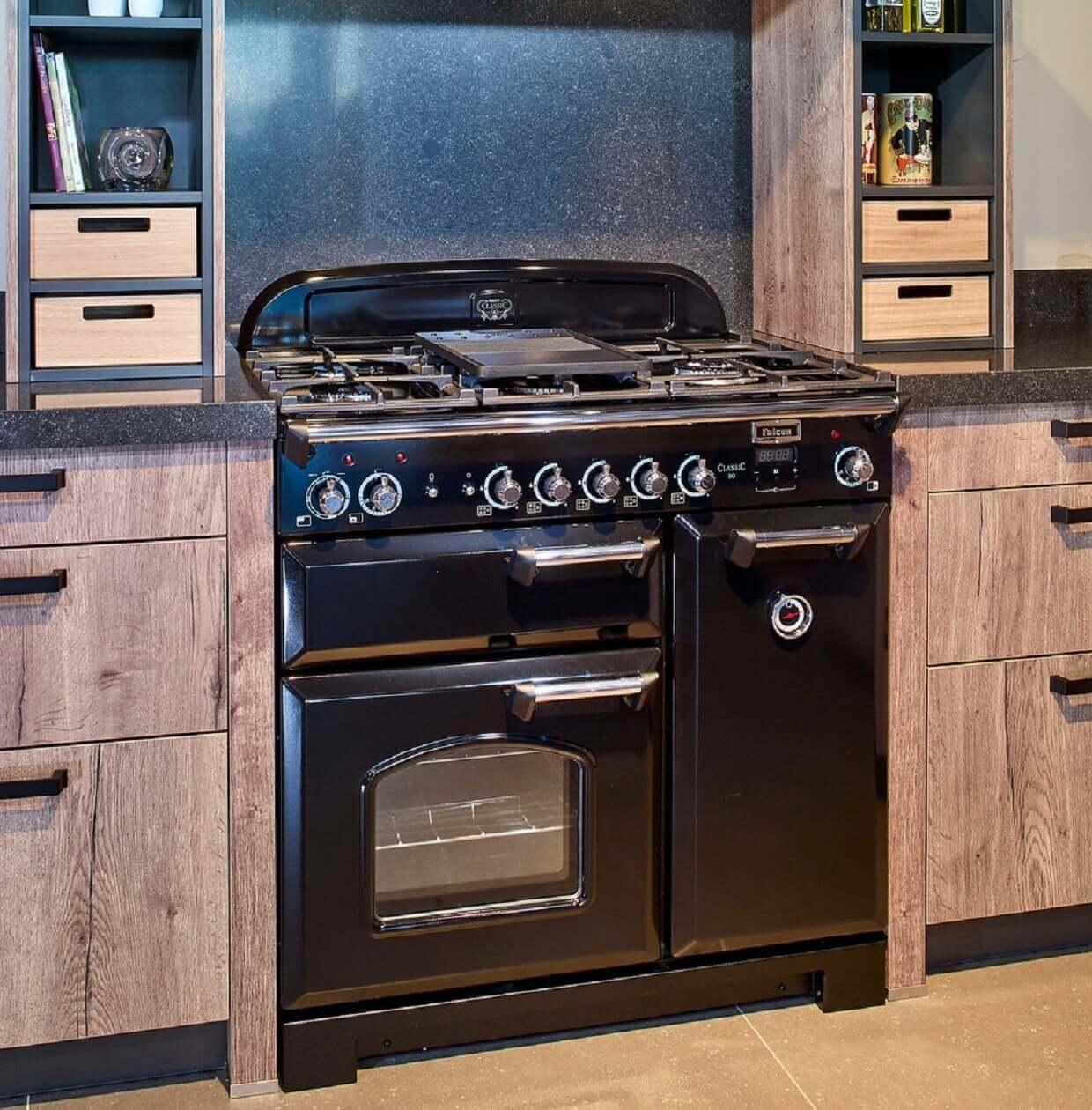 Landelijke houten keuken van het merk Schüller. Het wijnkruis en kratjes eronder geven een speels effect aan de keuken. De keuken is voorzien van apparatuur van ETNA en een mooi zwart fornuis van Falcon. Het aanrechtblad is een blad van composiet uit de Evora Quartz collectie van Dekker.