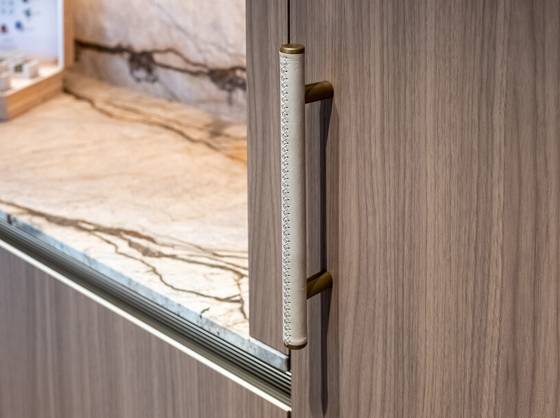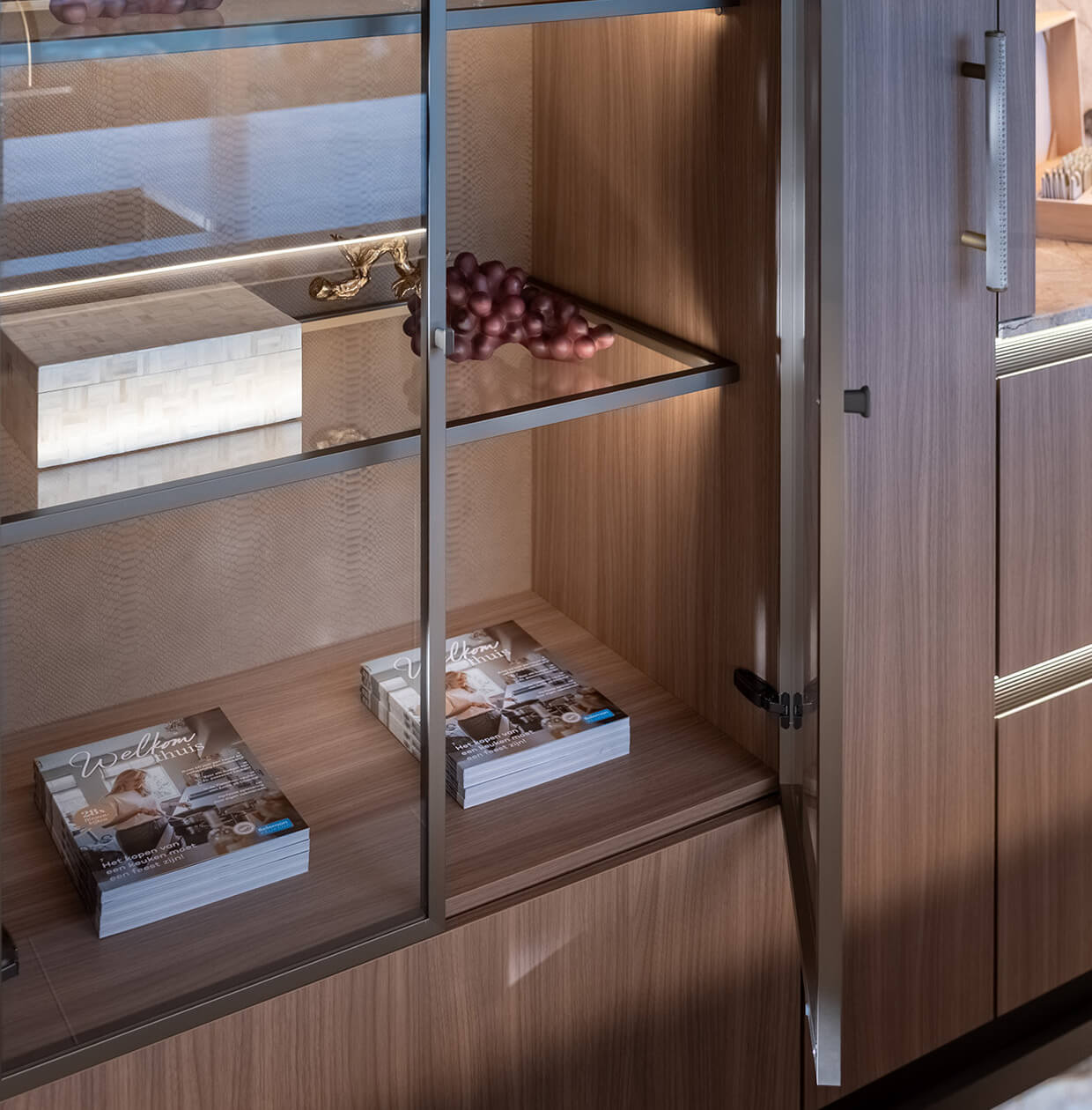 De kastenwand is uitgevoerd in de lichte houtkleur Poro Noce (LS96) van DecoLegno. U vindt er een opberg glaskast met een slangenlederen achterwand, een chique koffienis met afgeronde vorm én messing handgrepen voorzien van buffelleer en een verfijnde stiknaad. De afgeronde stollen geven de wand een zachte en hoogwaardige uitstraling.
