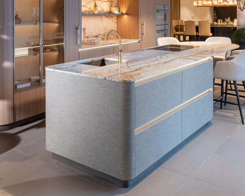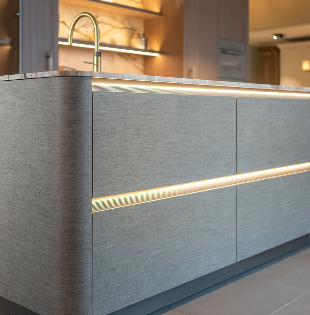 Het kook- en spoeleiland is voorzien van Alpaca (FD33) fronten in linnenstructuur, met greeplijsten in de warme bronstint Reflex (FC98). Ook dit eiland is rondom afgewerkt met afgeronde stollen voor een passend geheel.