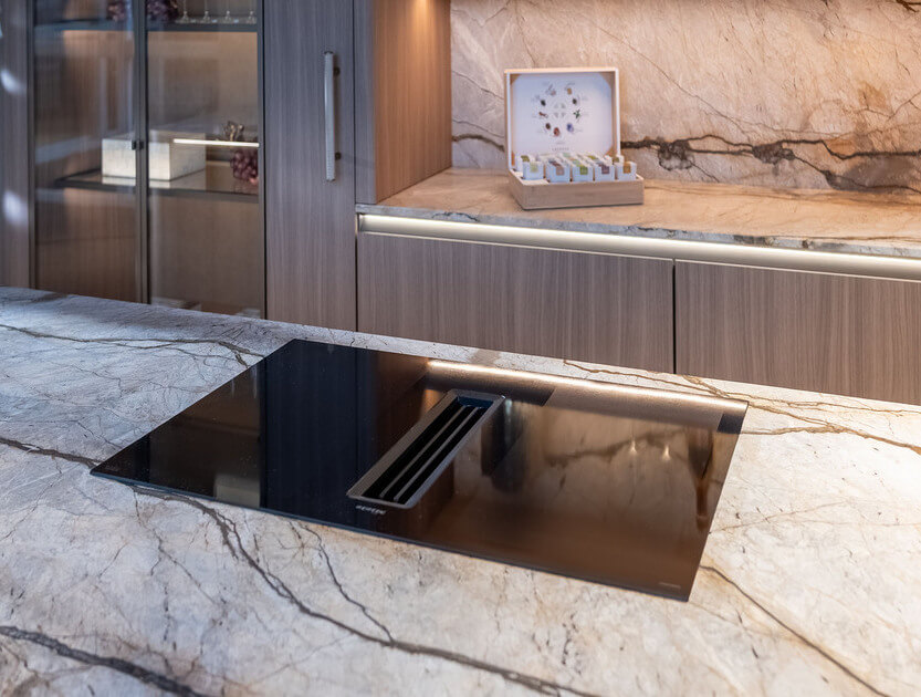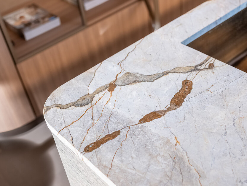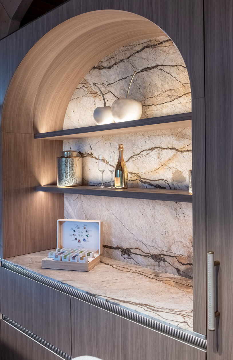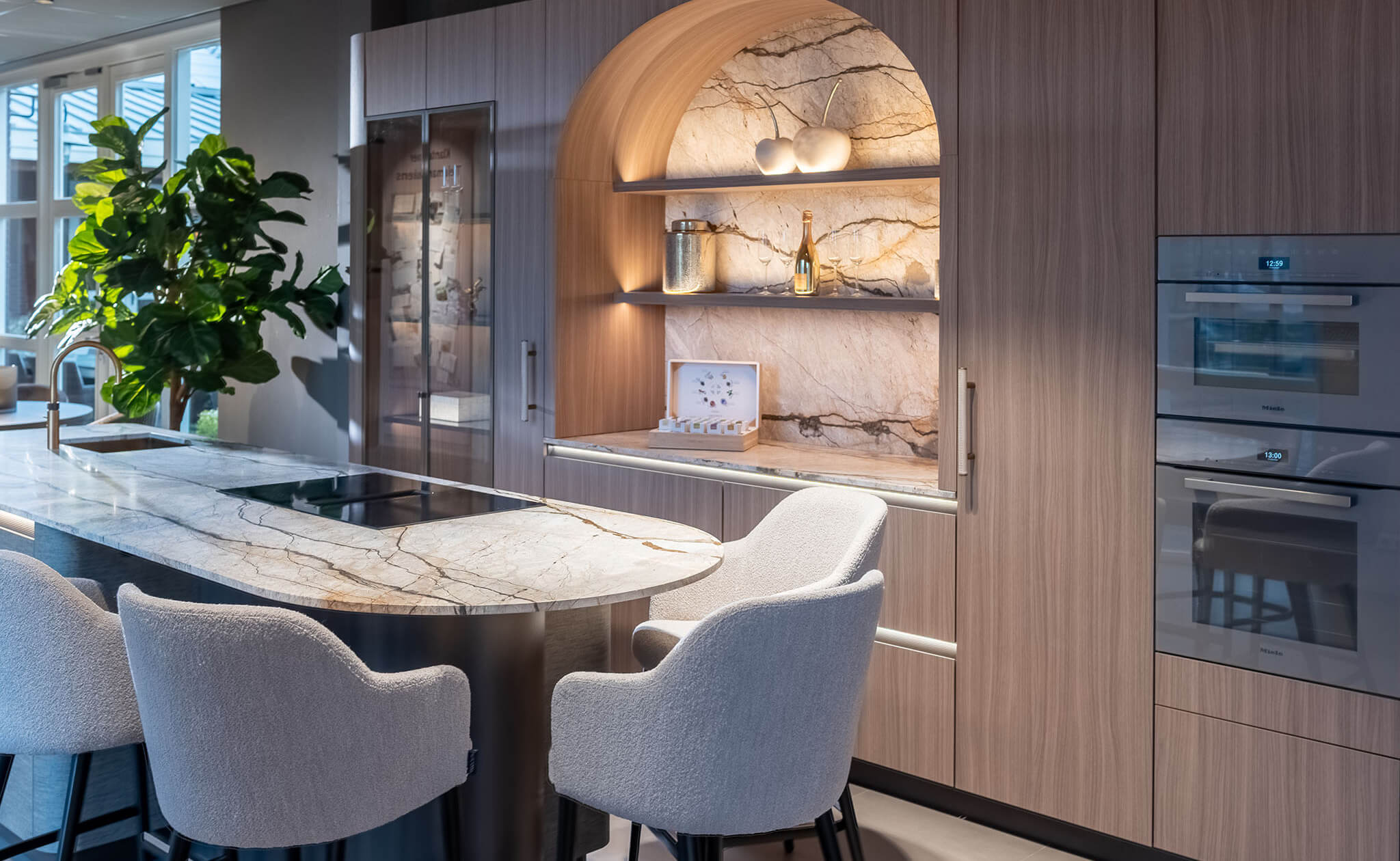 Het marmeren werkblad van Arte in de kleur Silver Roots is gepolijst voor extra glans. Opvallend is de ronde afwerking bij het bargedeelte. In de koffienis is hetzelfde marmer verwerkt als werkblad en achterwand voor een uniforme look.
