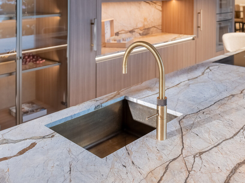 De Quooker Combi+ Fusion Round en Doeco Frenkie spoelbak zijn beide uitgevoerd in Messing Patina.