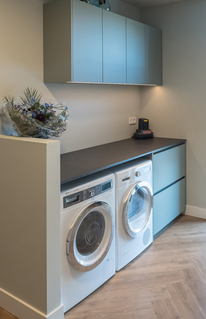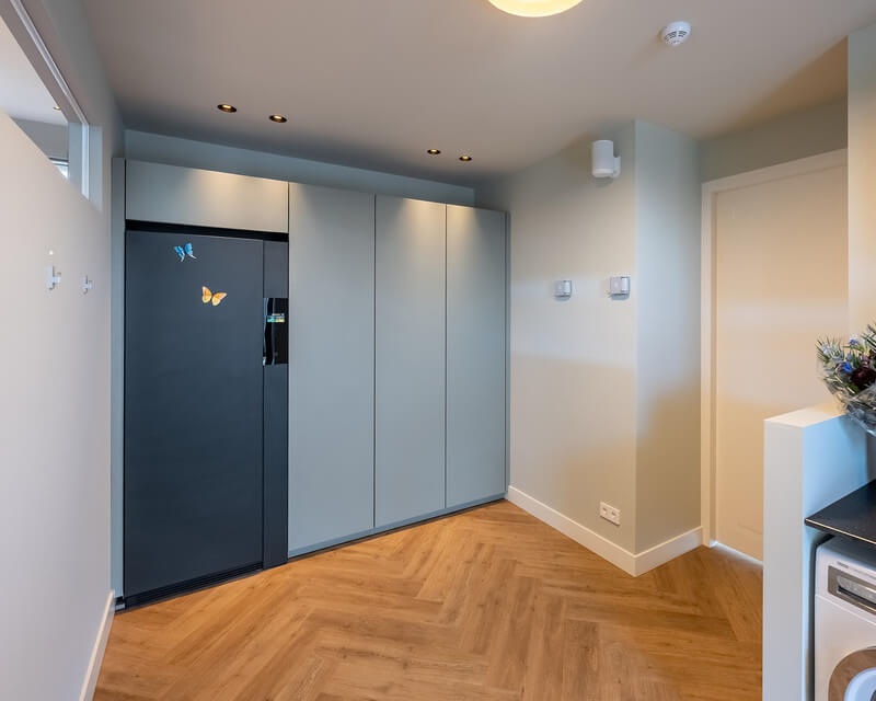 Deze ruime maatwerk bijkeuken is ontworpen en geplaatst door Tieleman Keukens, in samenwerking met Mereno. De ruimte is ingedeeld in drie functionele zones: een hoge kastenwand, een was- en drooggedeelte met bovenkasten en een spoelgedeelte. Elk onderdeel is op elkaar afgestemd voor optimaal gebruiksgemak én een rustige uitstraling.