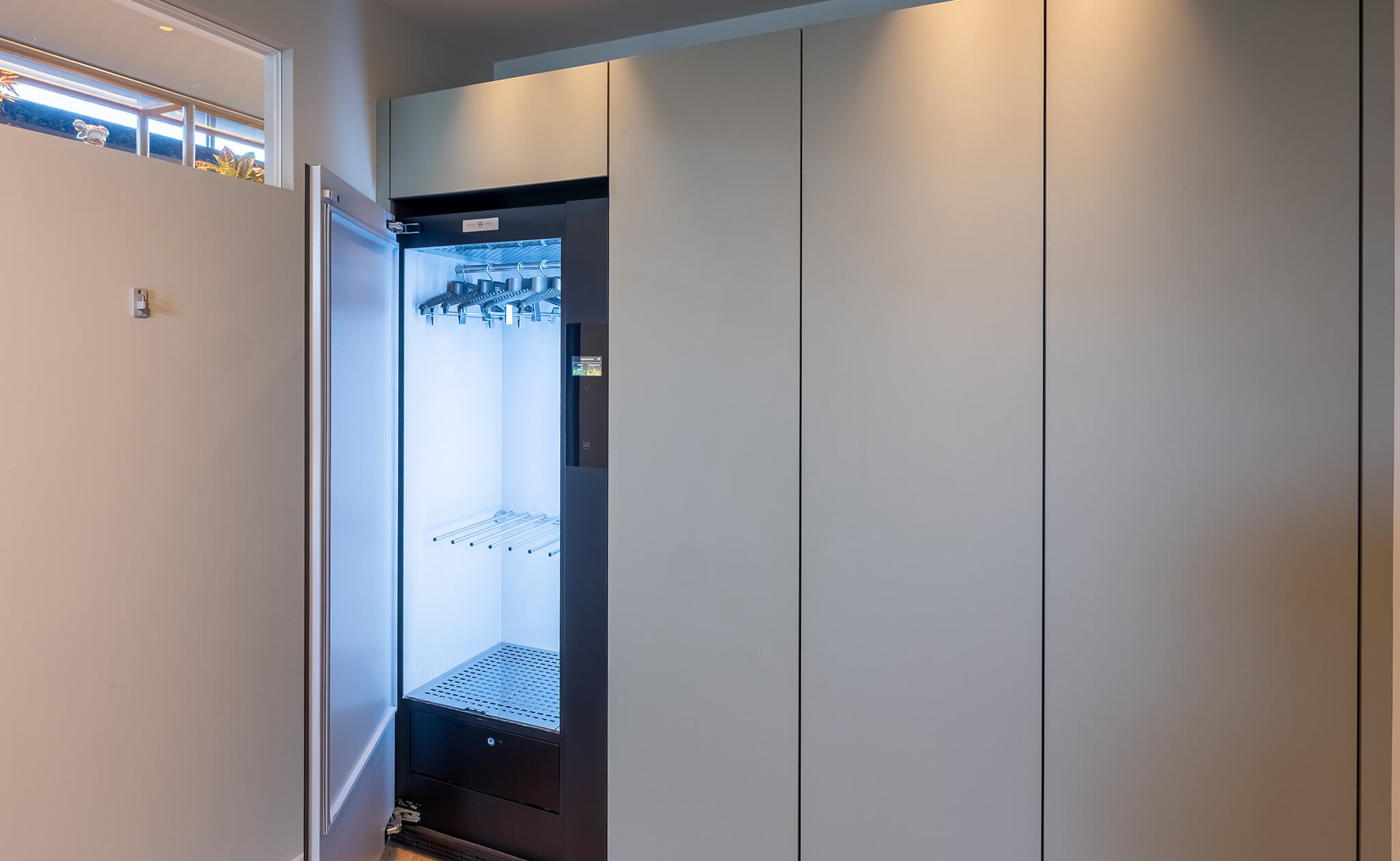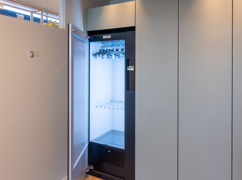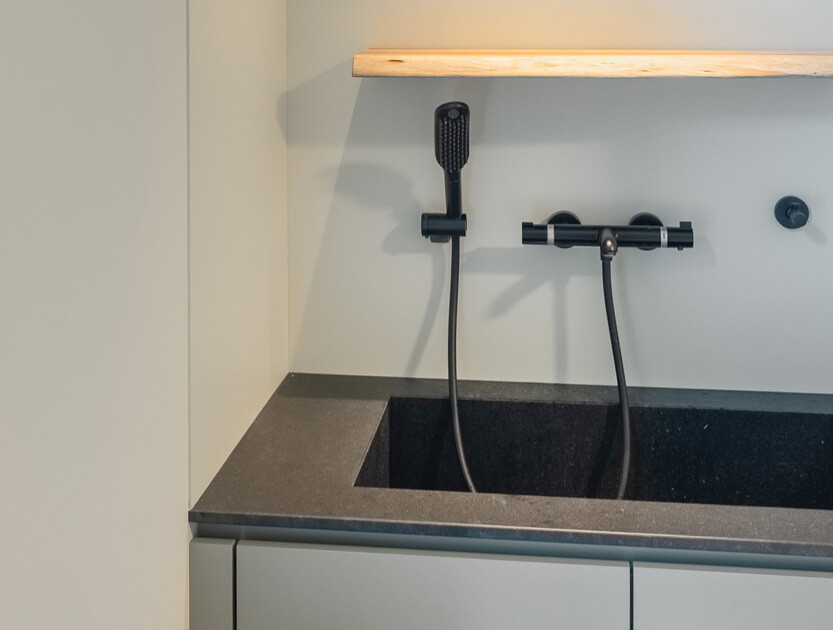 De bijkeuken is uitgevoerd in het model Milano van Mereno, met greeploze fronten, gespoten in de unieke kleur UB25 Ovatta: een zachte en tijdloze grijstint. De kastenwand biedt ruimte aan de bijzondere V-ZUG Refresh Butler en veel extra opbergruimte. Het werkblad en de stenen spoelbak van Grillo zijn in de kleur Nero Assoluto Anticato, een donkere natuursteen-look.