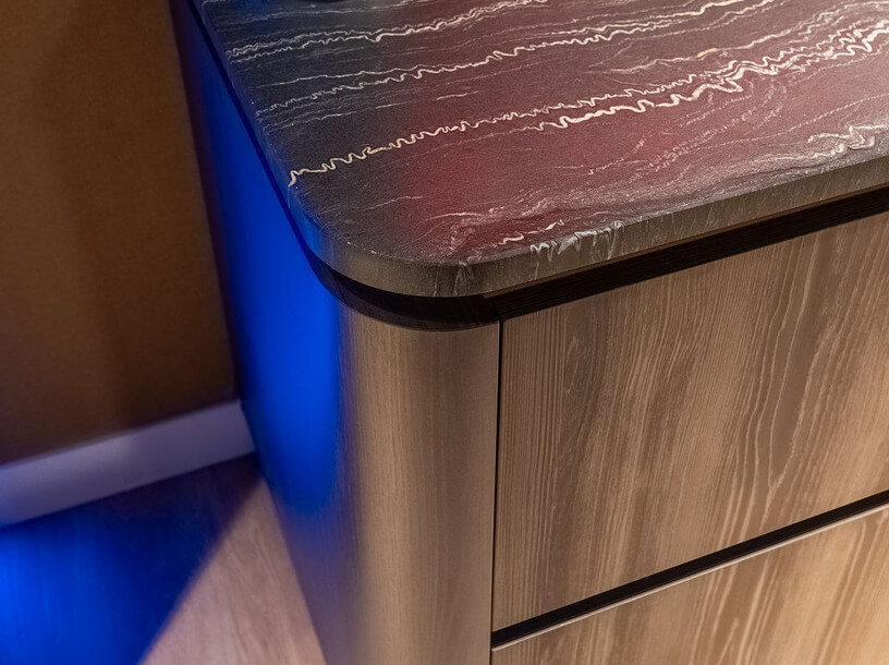 De fronten van deze bar zijn uitgevoerd in de warme houttint Espria/Maloja (S133), met afgeronde hoeken die zorgen voor een zachte en luxe uitstraling. Het RVS frame is gespoten in Valspar Goud van Bokmerk en vormt een stijlvol accent dat perfect past bij het hoogwaardige karakter van de bar. De houten latten aan de voorzijde geven een eigentijdse look.