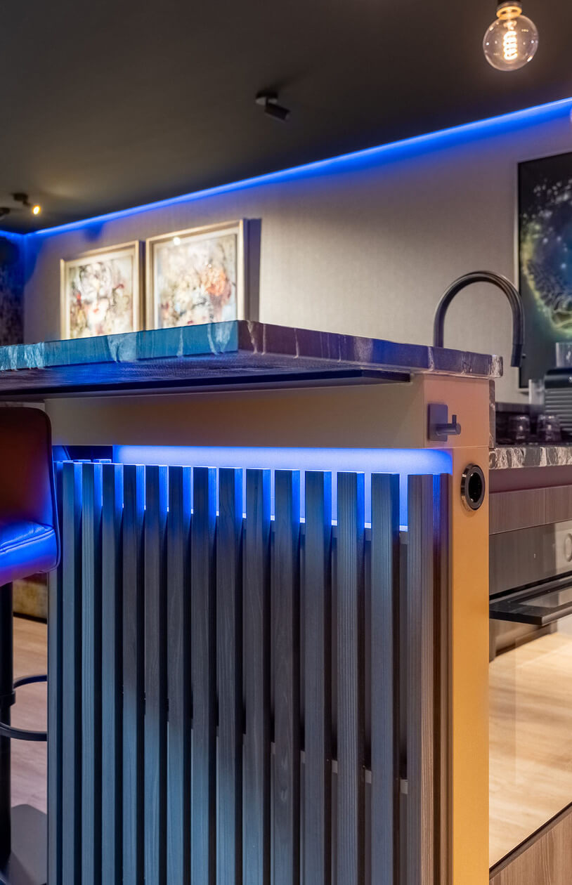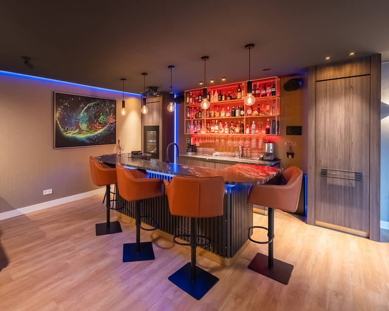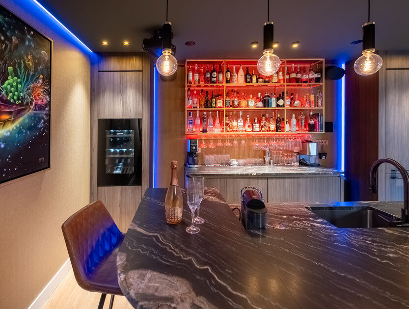 Zowel het aanrecht- als het barblad zijn van Grillo in de kleur Nero Bernini Satinato en hebben een afgeronde afwerking voor een verfijnde, natuurlijke uitstraling. De geïntegreerde LED-verlichting zorgt voor sfeer op elk moment van de dag. Dankzij de hoogwaardige apparatuur van V-ZUG en Liebherr is deze bar van alle moderne gemakken voorzien.