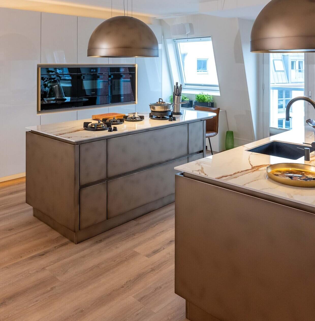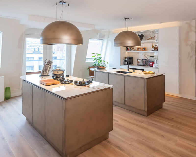 Luxe woonkeuken met dubbel eiland in bronskleur