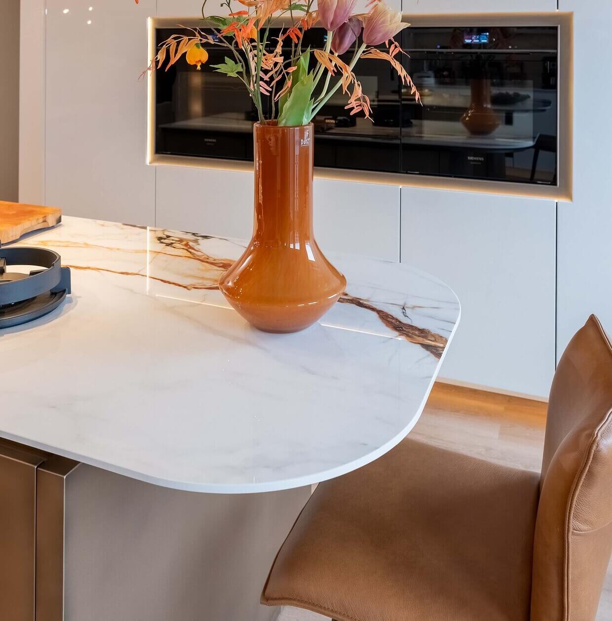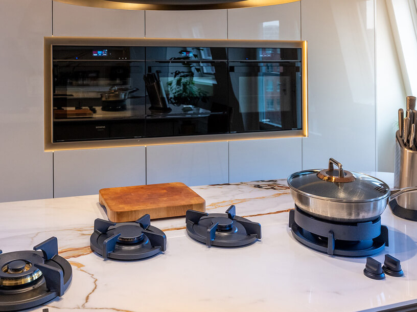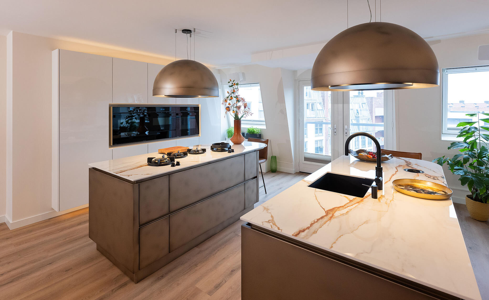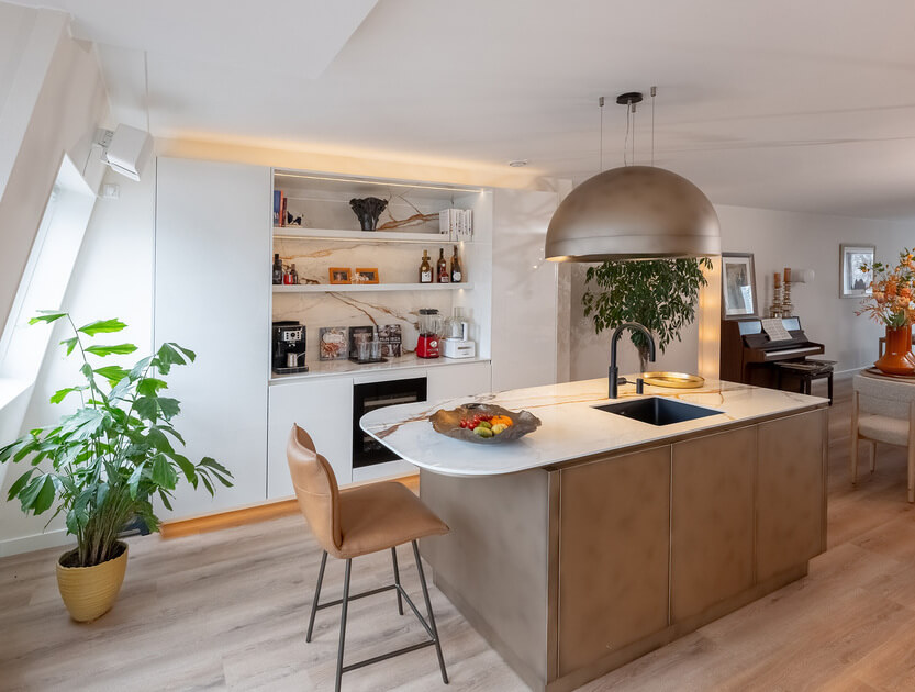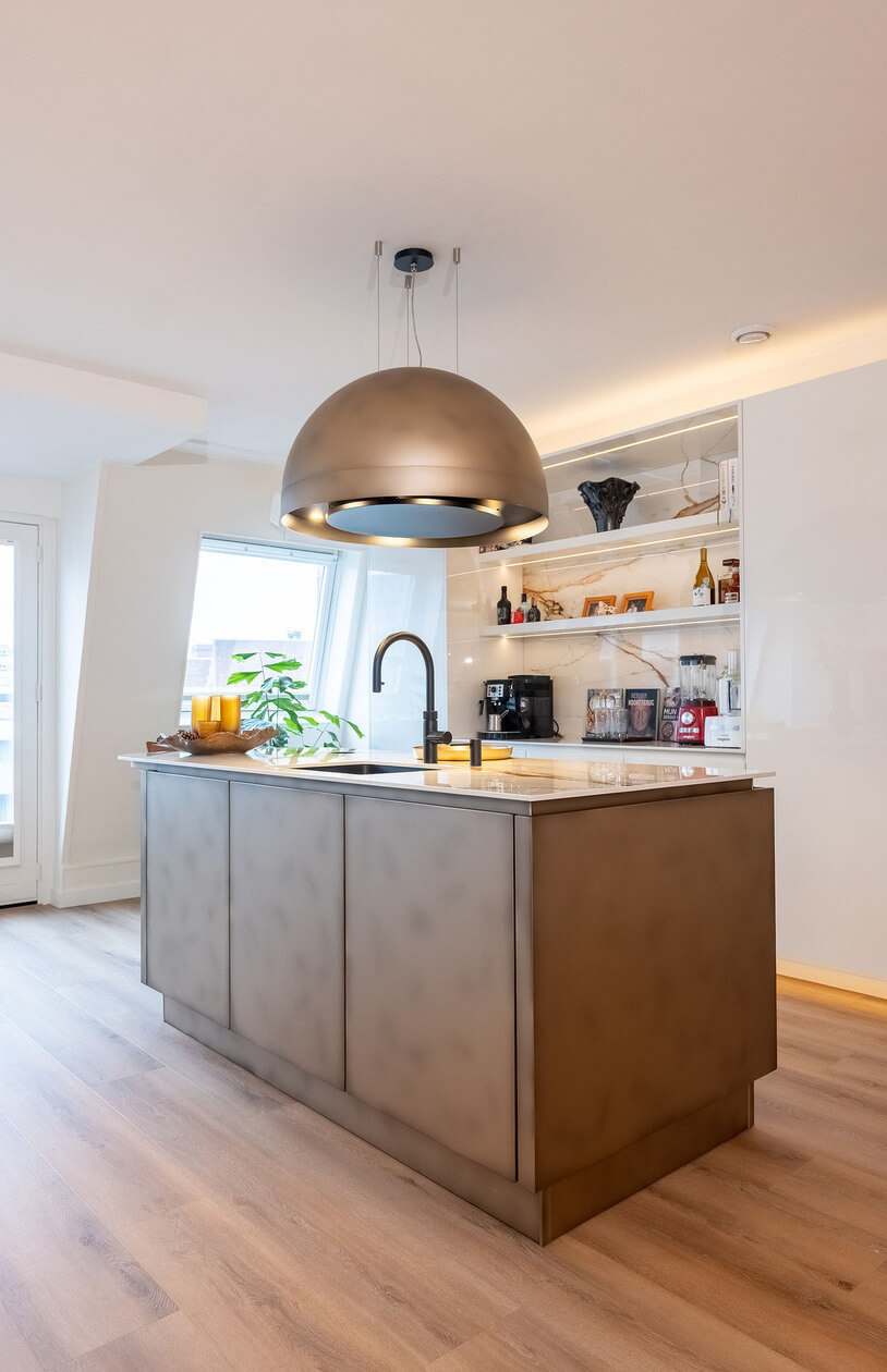 Het ontwerp valt direct op door de slimme indeling met een apart kook- en spoeleiland. Beide eilanden zijn voorzien van barbladen met ronde hoeken, wat een zachte en uitnodigende uitstraling geeft. Boven de eilanden hangen twee Wave-units in exact dezelfde bronzen stijl: een afzuigkap boven het kookgedeelte en een bijpassende lamp boven het spoeleiland. Mereno heeft deze units speciaal overgespoten in de kleur van de fronten om er één prachtig geheel van te maken.