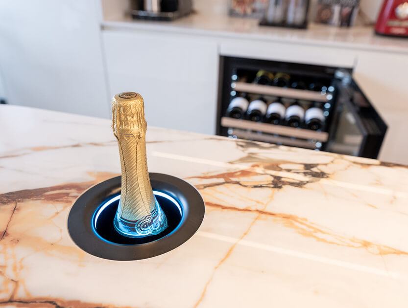 - Wijn en koeling: Kaelo Plus wijnkoeler in het blad, een wijnklimaatkast van Forvino en koelkasten van Liebherr.