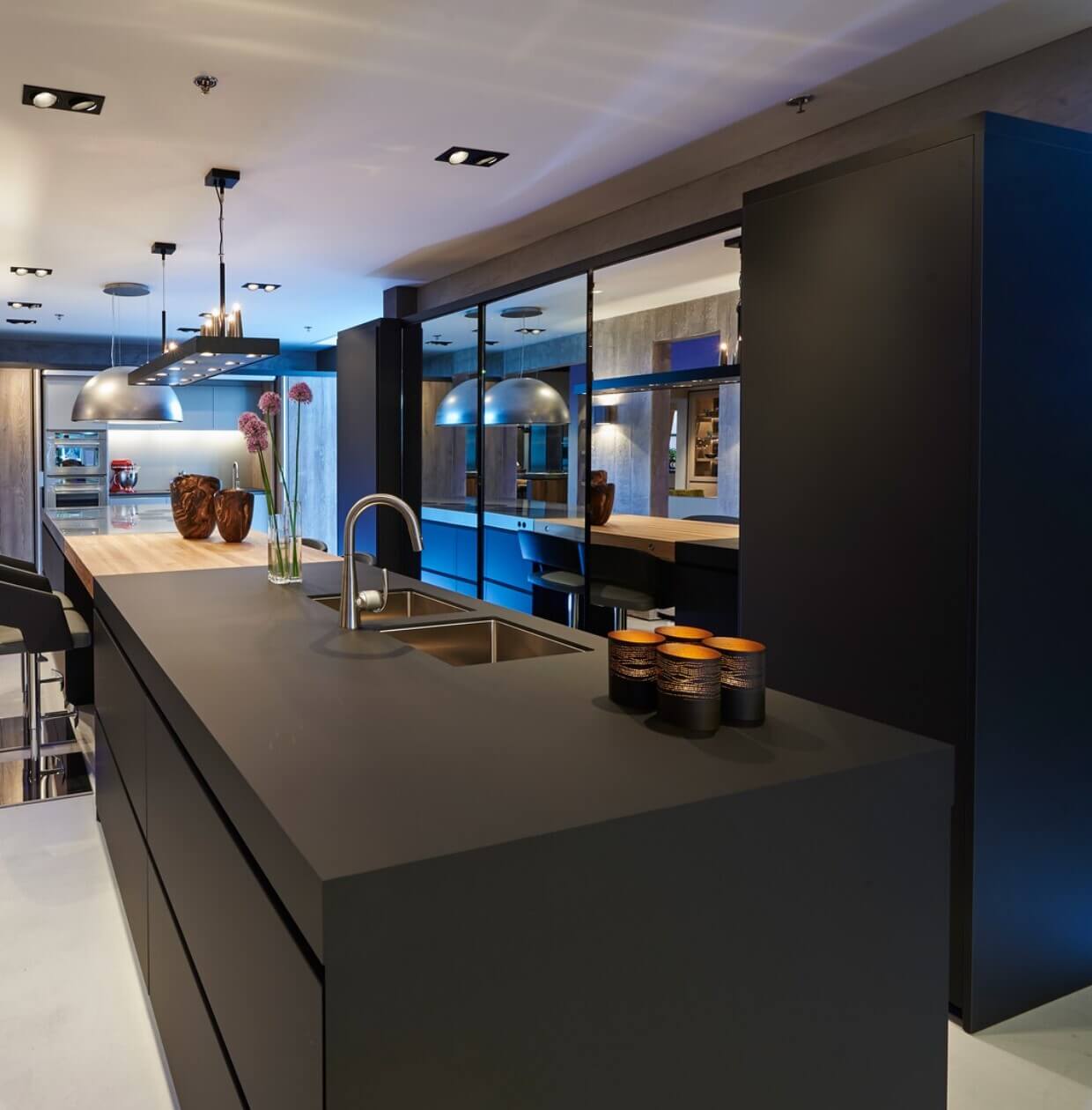 Hypermoderne luxe eilandkeuken met onder andere matzwart fenix keukenkasten strak in verstek.