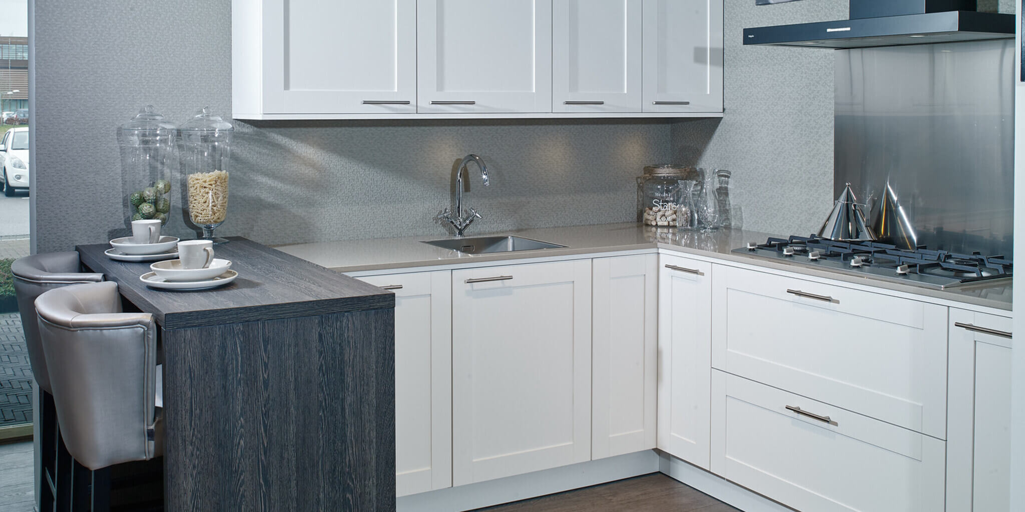 Deze tijdloze L-keuken met kastenwand en houten bar is uitgevoerd in een rustig kaderfront en taupe aanrechtblad.
